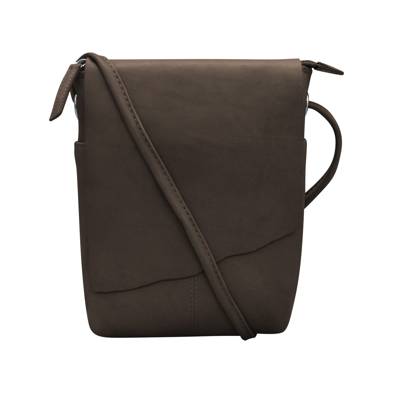 Front slip pocket under flap and back zip pocket. Inside zip pocket.