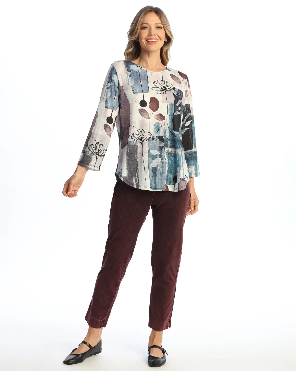 POLY SPANDEX 3/4 SLEEVE ROUND HEM TOP (PRINT PLACEMENT MAY VARY)