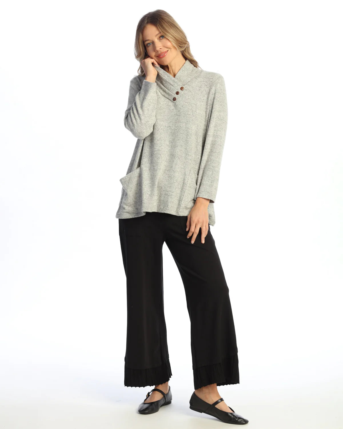 BRUSHED HACCI PLEAT NECK WITH BUTTON DETAIL TOP
