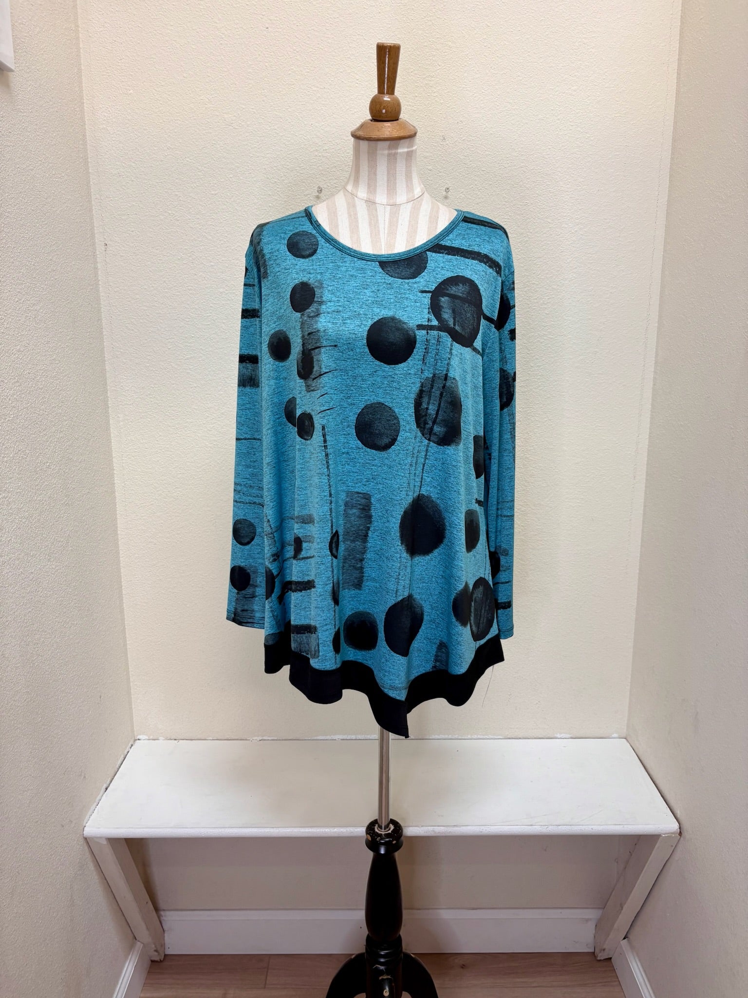 Elegant asymmetric tunic crafted from luxurious slinky knit fabric, featuring striking black contrast detailing. This refined piece effortlessly elevates any wardrobe with its modern silhouette and sophisticated design. Perfect for creating polished, contemporary looks with minimal effort.