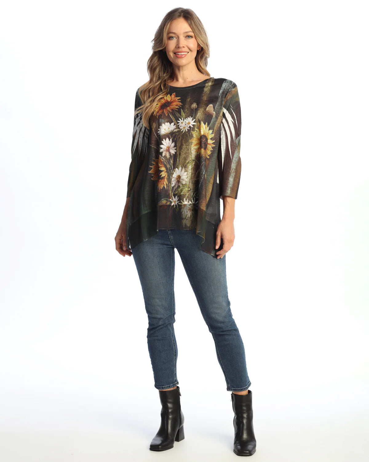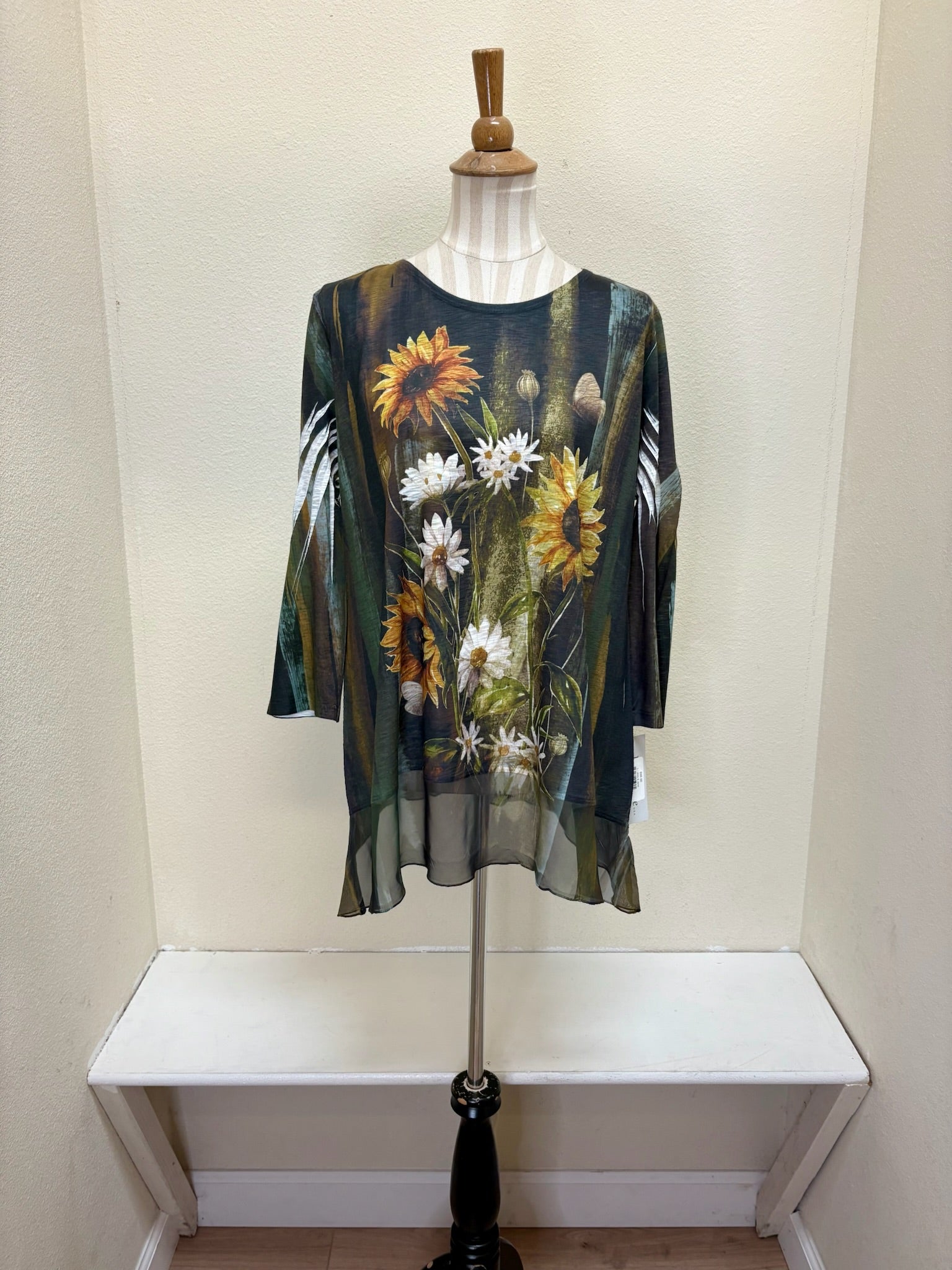 Elegant tunic silhouette crafted from flowing chiffon with striking contrast detailing. This refined piece effortlessly transitions from casual to dressy occasions, offering a flattering fit that celebrates movement and grace. Perfect for layering or wearing solo, it's a versatile wardrobe essential that exudes understated sophistication.