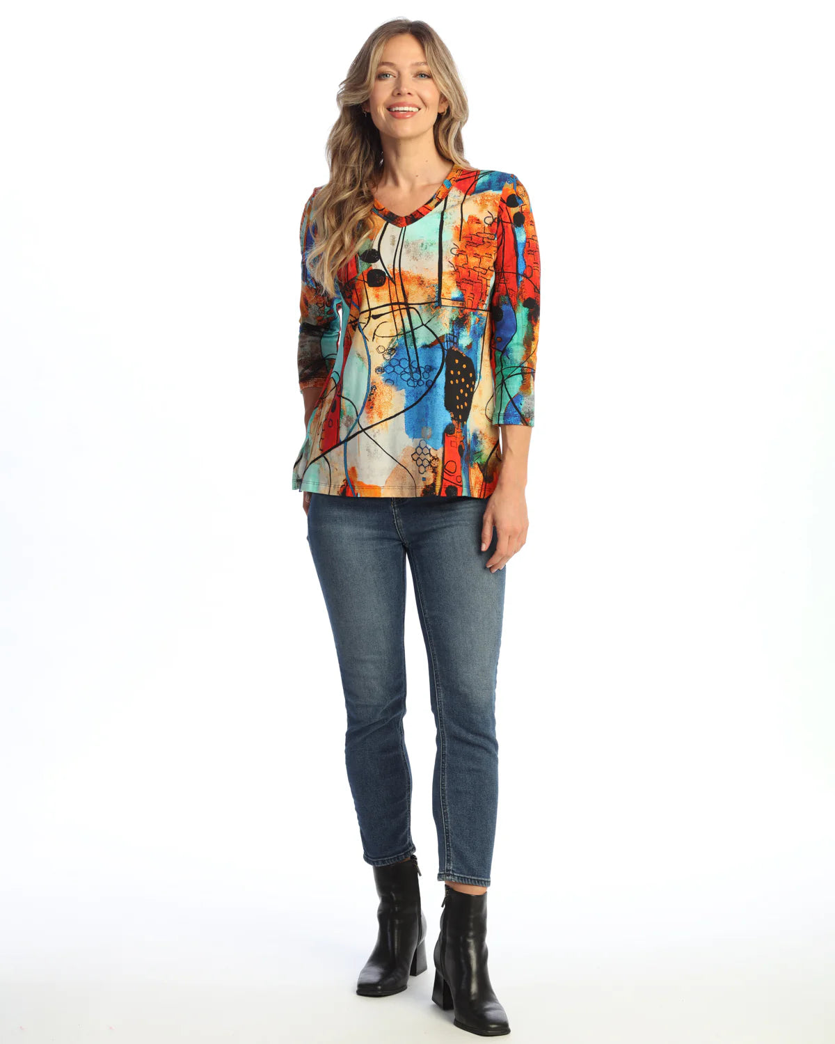 COTTON SPANDEX ROUNDED V-NECK TOP W/ SIDE SLITS (PRINT PLACEMENT MAY VARY)