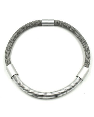 Necklace w/ a soft cord in the back and a steel spring upfront, separated by two aluminum cylinders - magnetic closure.