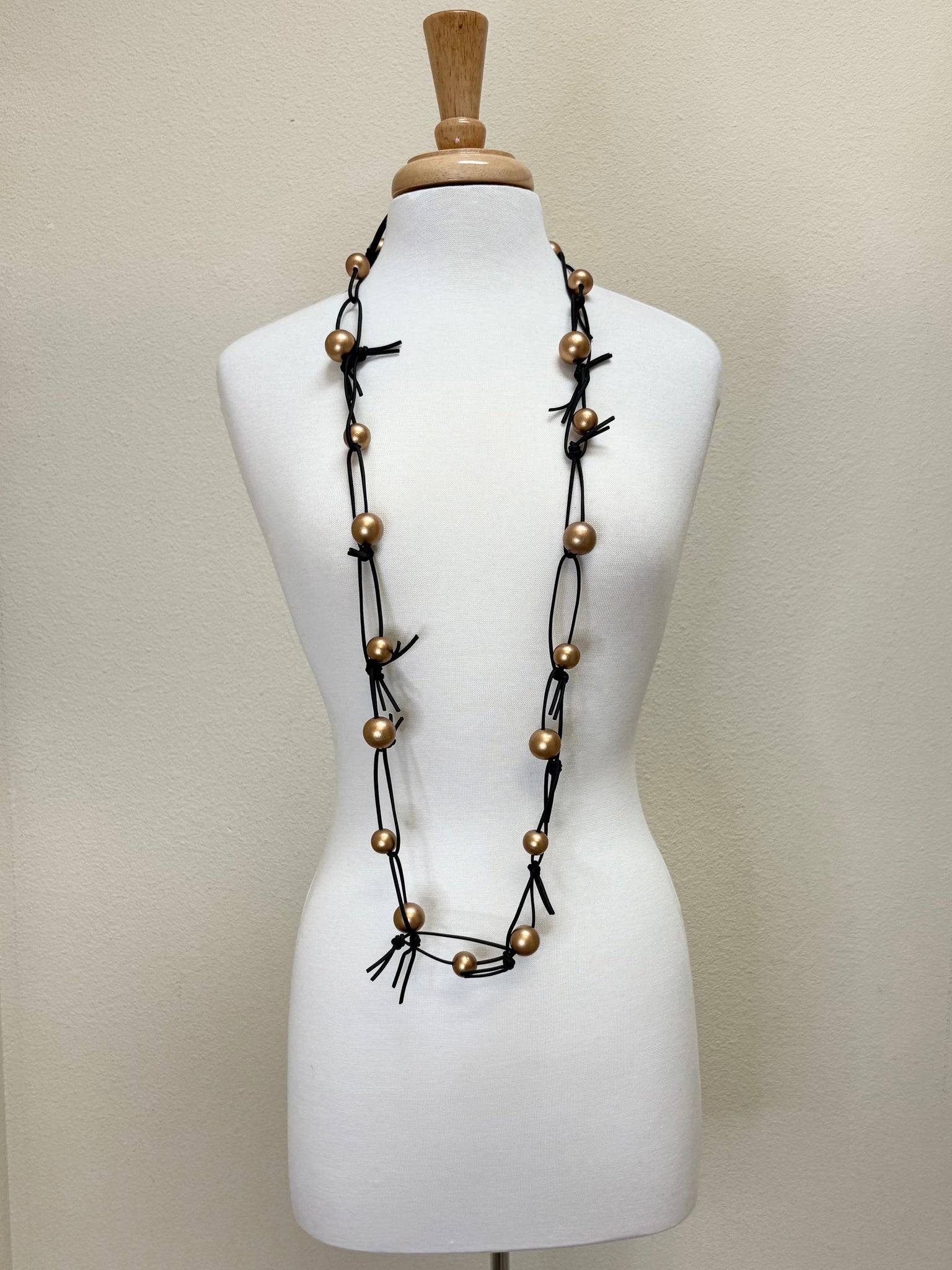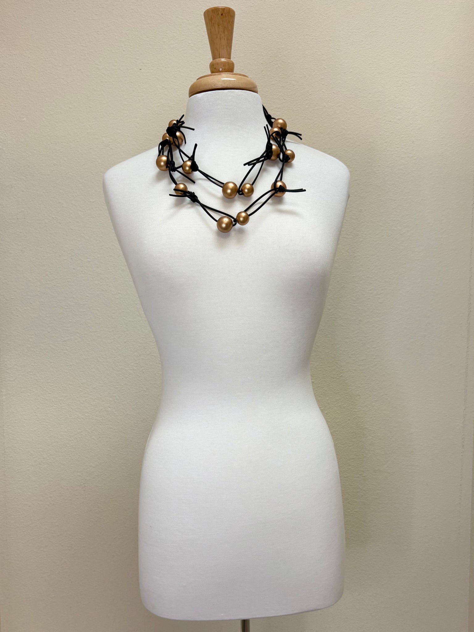 The JIANHUI LONDON Gold Round Beads On Leatherette Chain Necklace features gold-painted wooden beads elegantly accented by a leather cord wrapped and secured at several intervals. This distinctive detail enhances texture and visual interest. Designed on a flexible leatherette chain, the necklace can be looped to create multiple styling options, providing both sophistication and adaptability for diverse looks.