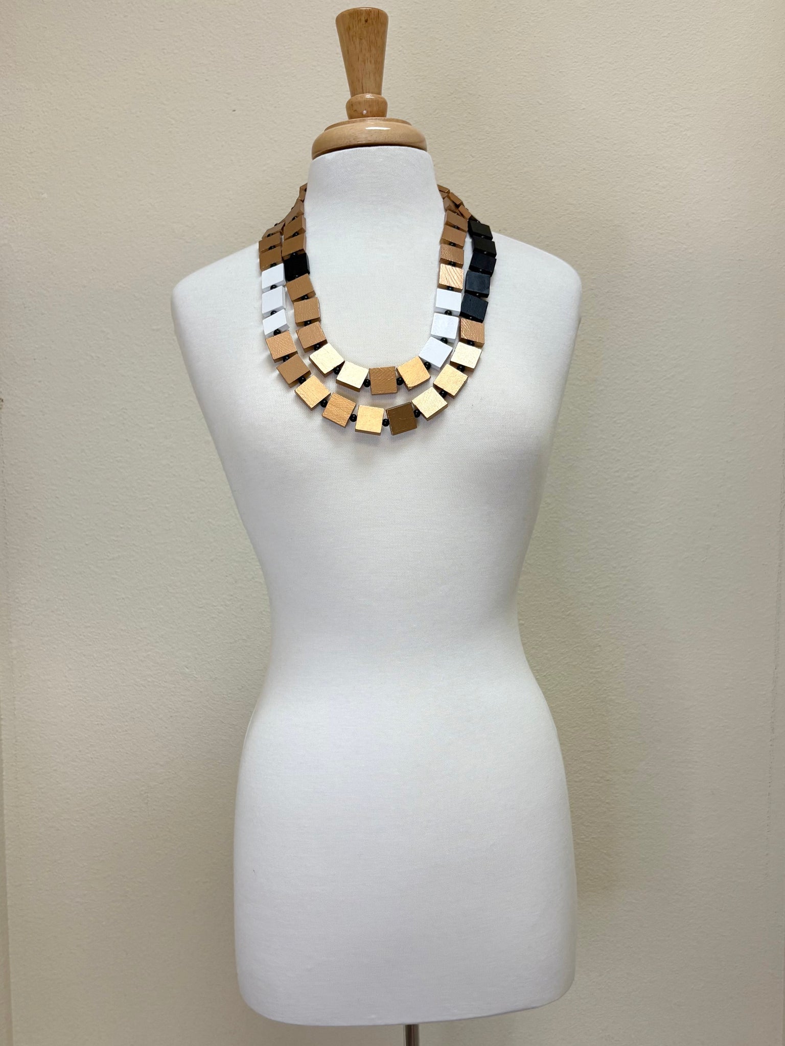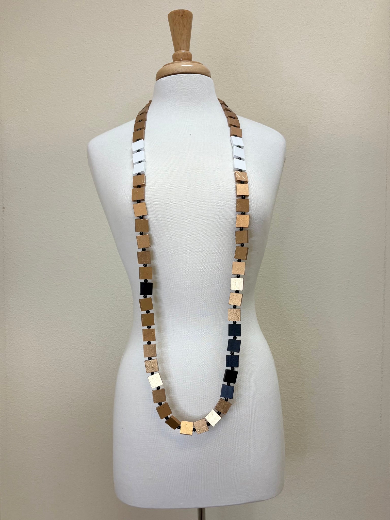 The JIANHUI LONDON Multicolor Square Block Necklace showcases hand-painted wood square beads in tan, black, white, and gold. The natural color palette merges sophistication with flexibility. Its extended length allows for multiple styling options, adapting seamlessly to various looks from casual to formal. This piece is a refined choice for those seeking distinctive, adaptable jewelry with artistic craftsmanship.