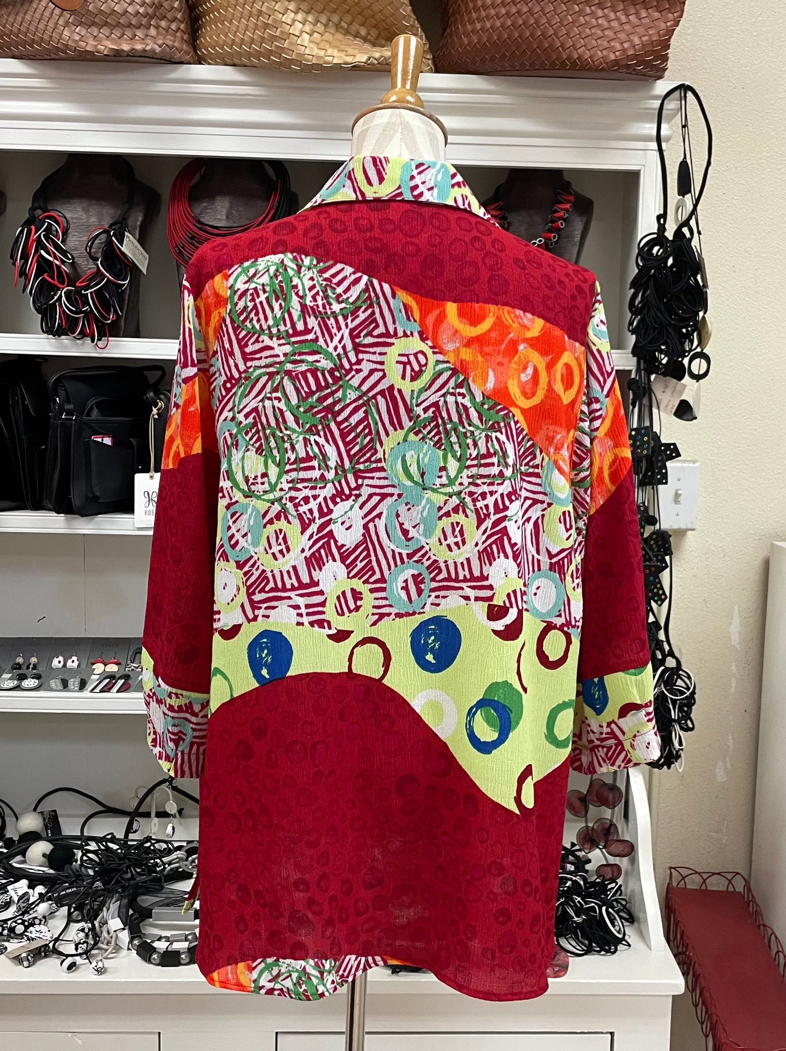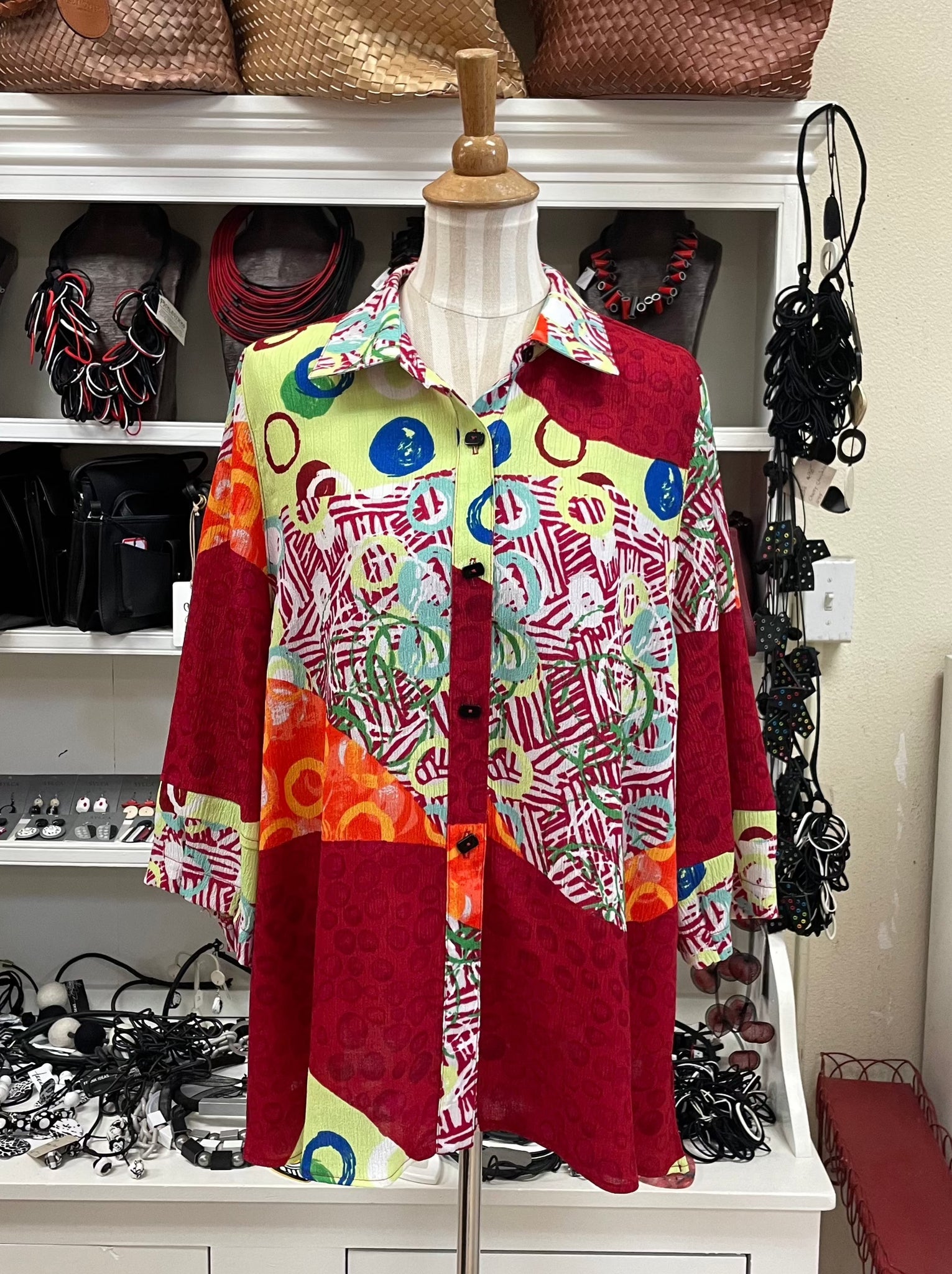 Experience the mesmerizing beauty of our Moonlight Top - 3540. This abstract top features stunning shades of red, orange, and green that evoke the mystical feeling of a moonlit night. Made with high-quality materials, this top is both stylish and comfortable, making it a must-have for any wardrobe.
