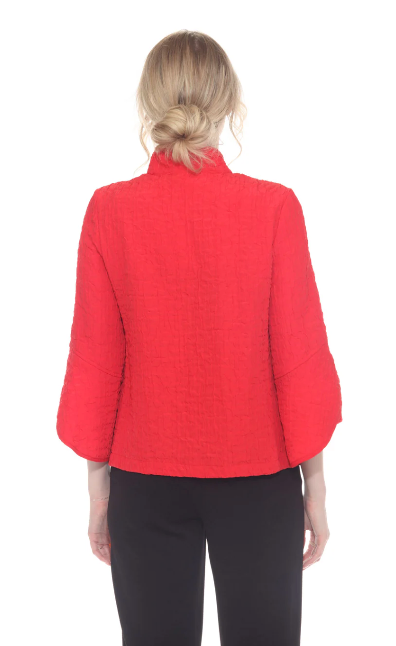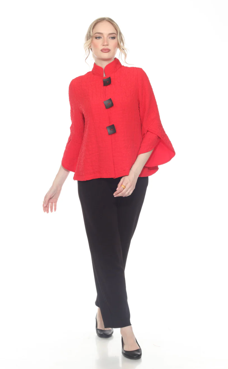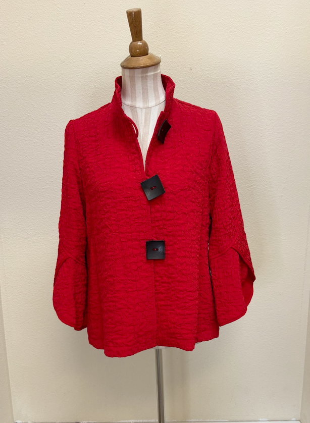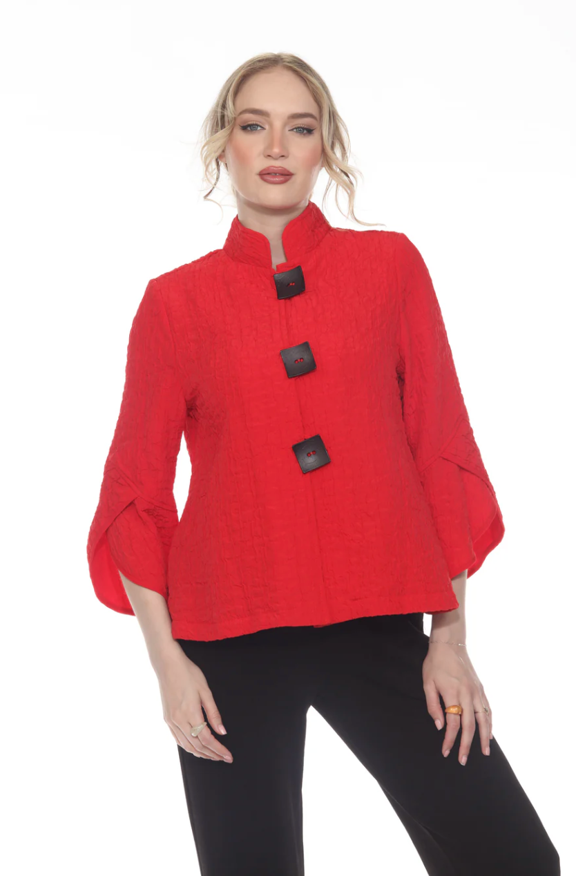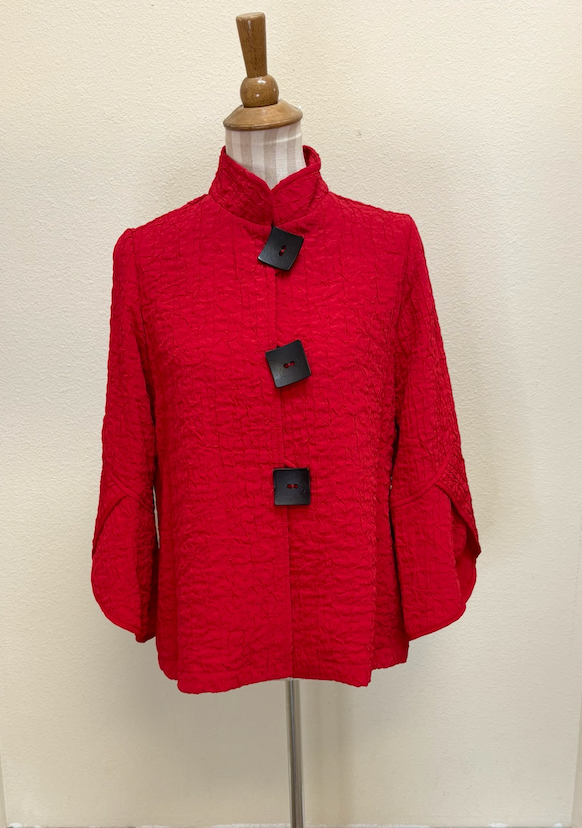 Crafted from vibrant red textured fabric with a delicate sheen, this moonlight jacket features a high, stand-up mandarin collar. Its three oversized square buttons create a striking contrast, while the subtly flared slit sleeves enhance the tailored A-line silhouette.