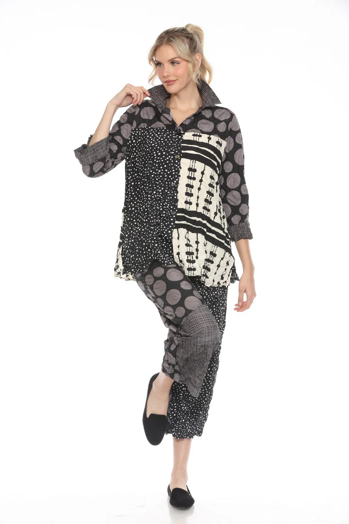 Expertly crafted, the Moonlight Top features a unique black design with geometric shapes and white and grey accents. Elevate your style with this modern and sophisticated top, perfect for any occasion.