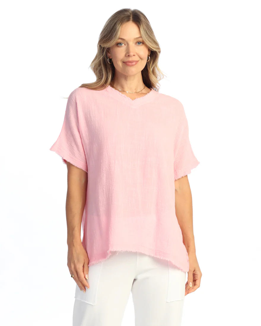 GARMENT DYED SHORT-SLEEVE GAUZE TOP W/ SOFT FRINGE ACCENTS