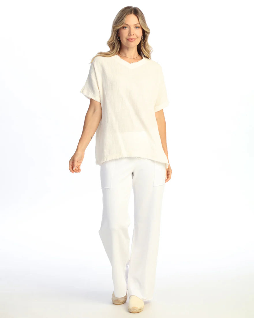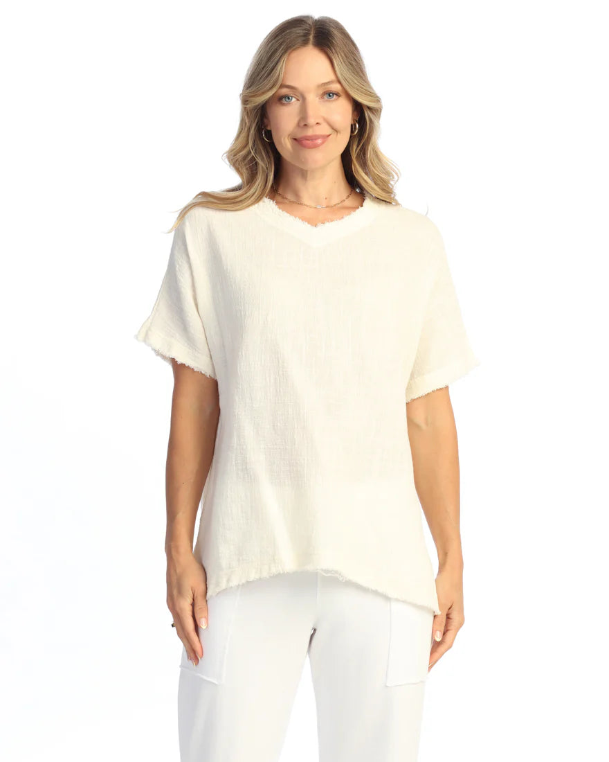 GARMENT DYED SHORT-SLEEVE GAUZE TOP W/ SOFT FRINGE ACCENTS