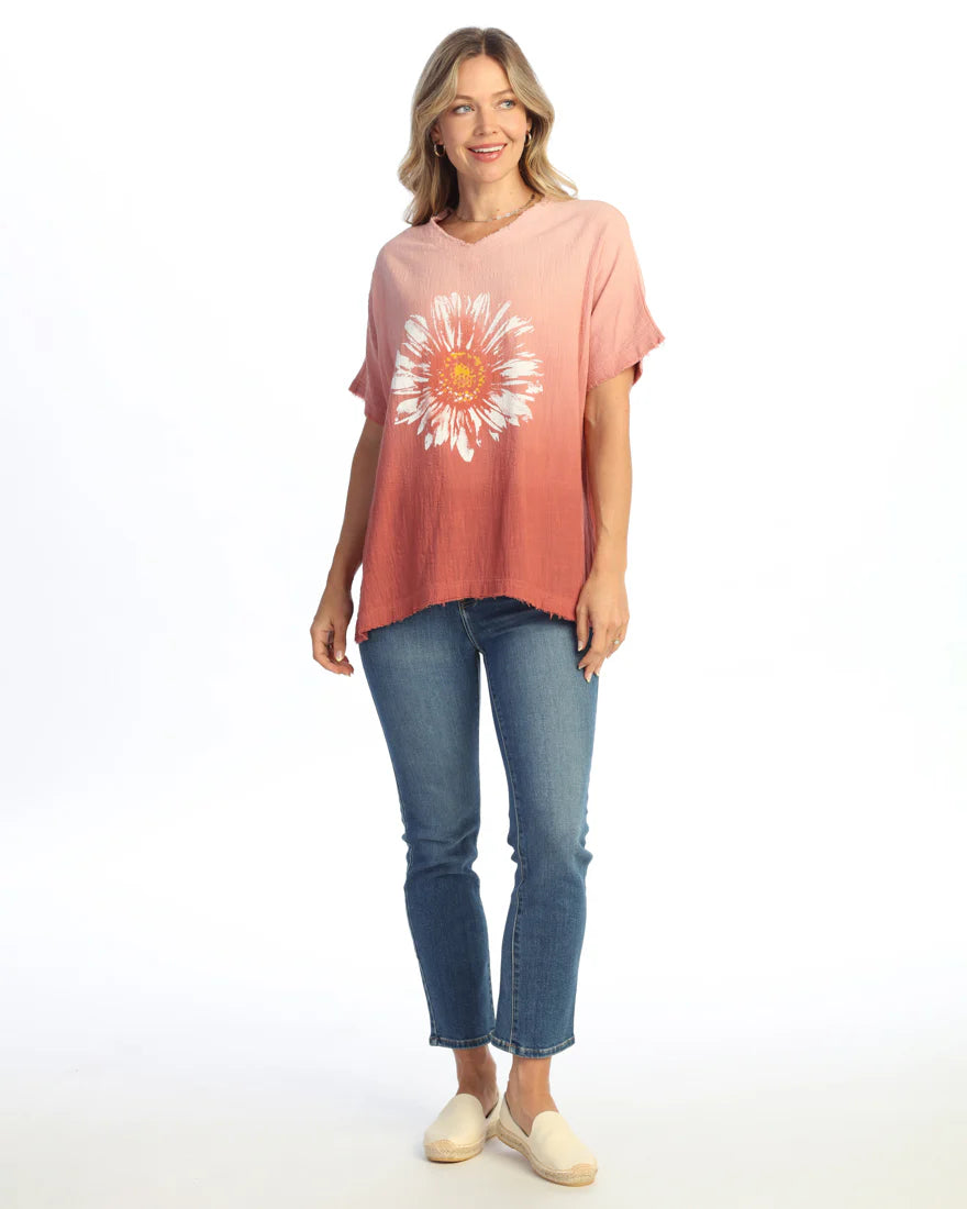 GARMENT DYED SHORT-SLEEVE GAUZE TOP W/ SOFT FRINGE ACCENTS