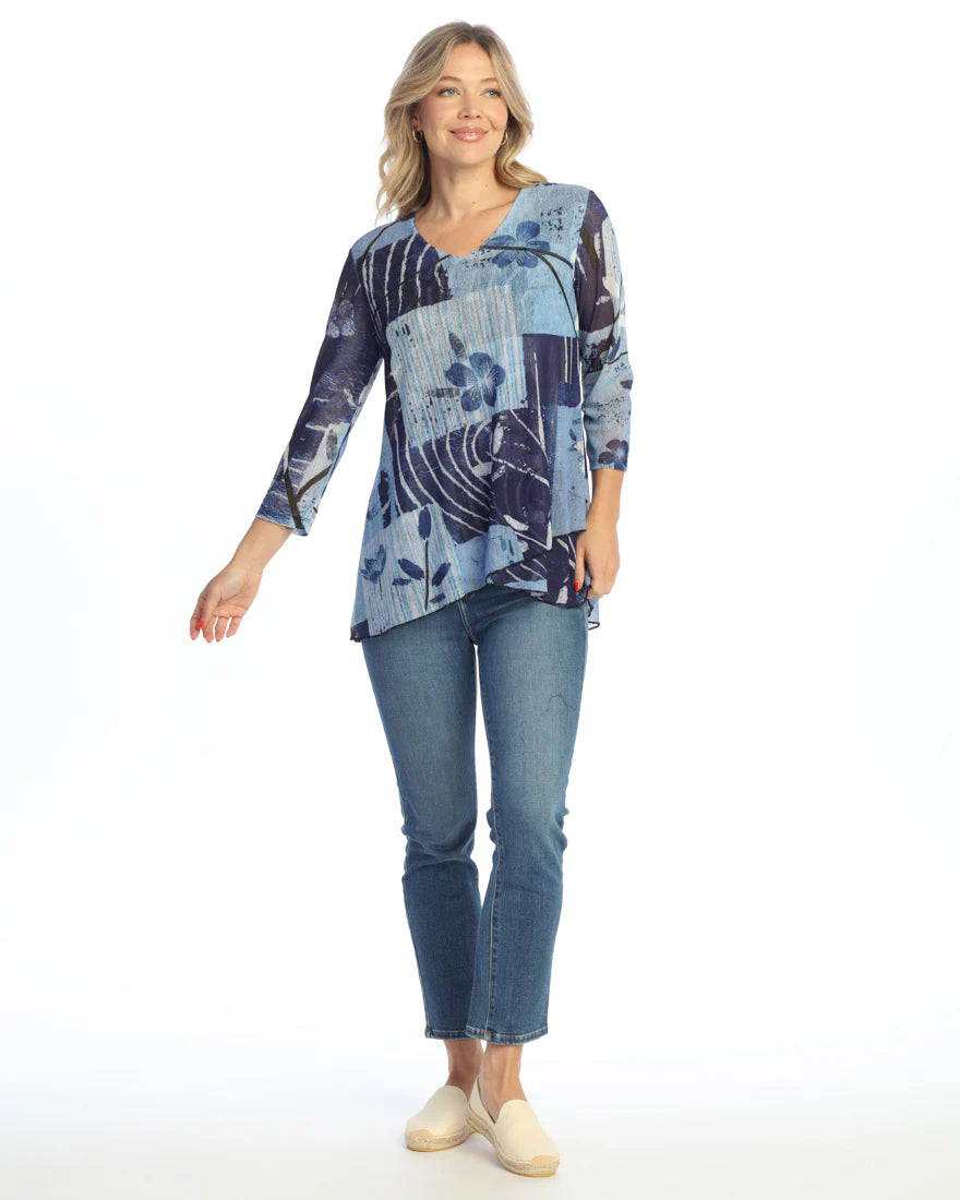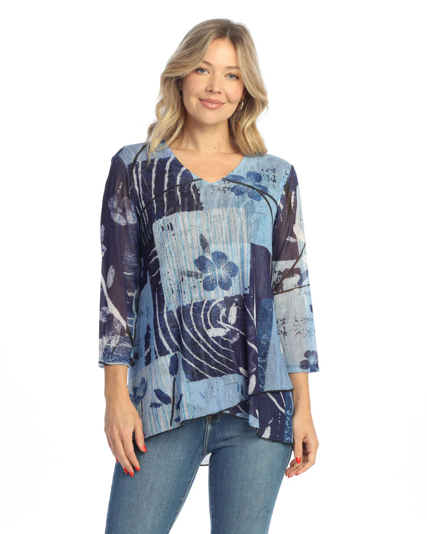 CREPE MESH V-NECK TUNIC TOP WITH LAYERED HEM