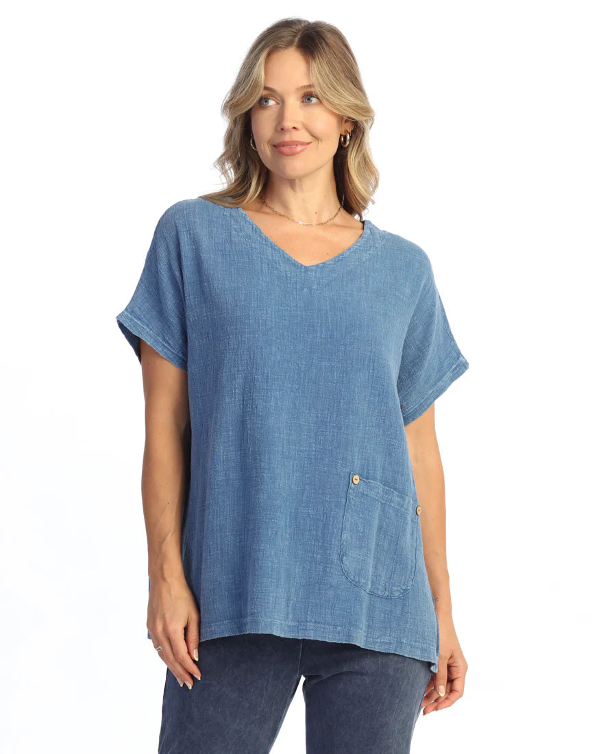 GARMENT DYED 100% COTTON SHORT-SLEEVE TOP W/ FAT RIB CONTRAST AND POCKET