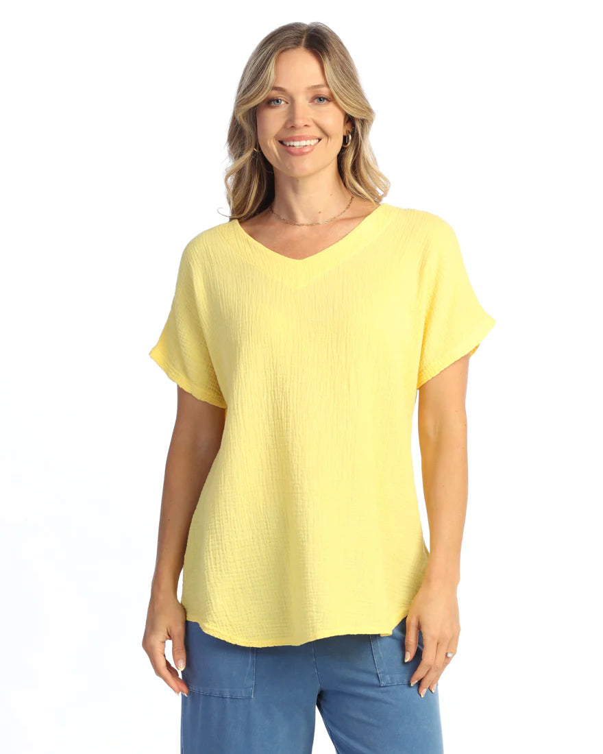 GARMENT DYED DOUBLE GAUZE V-NECK SHORT-SLEEVE TOP W CURVED HEM