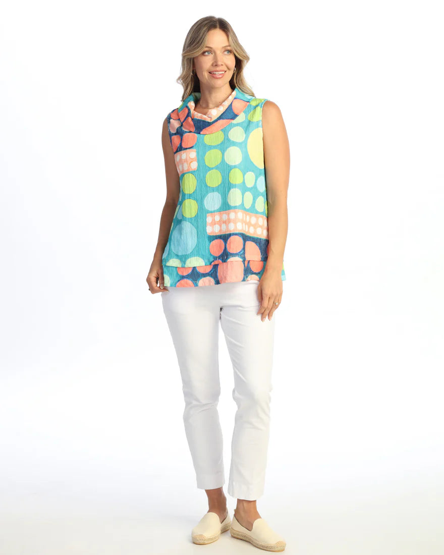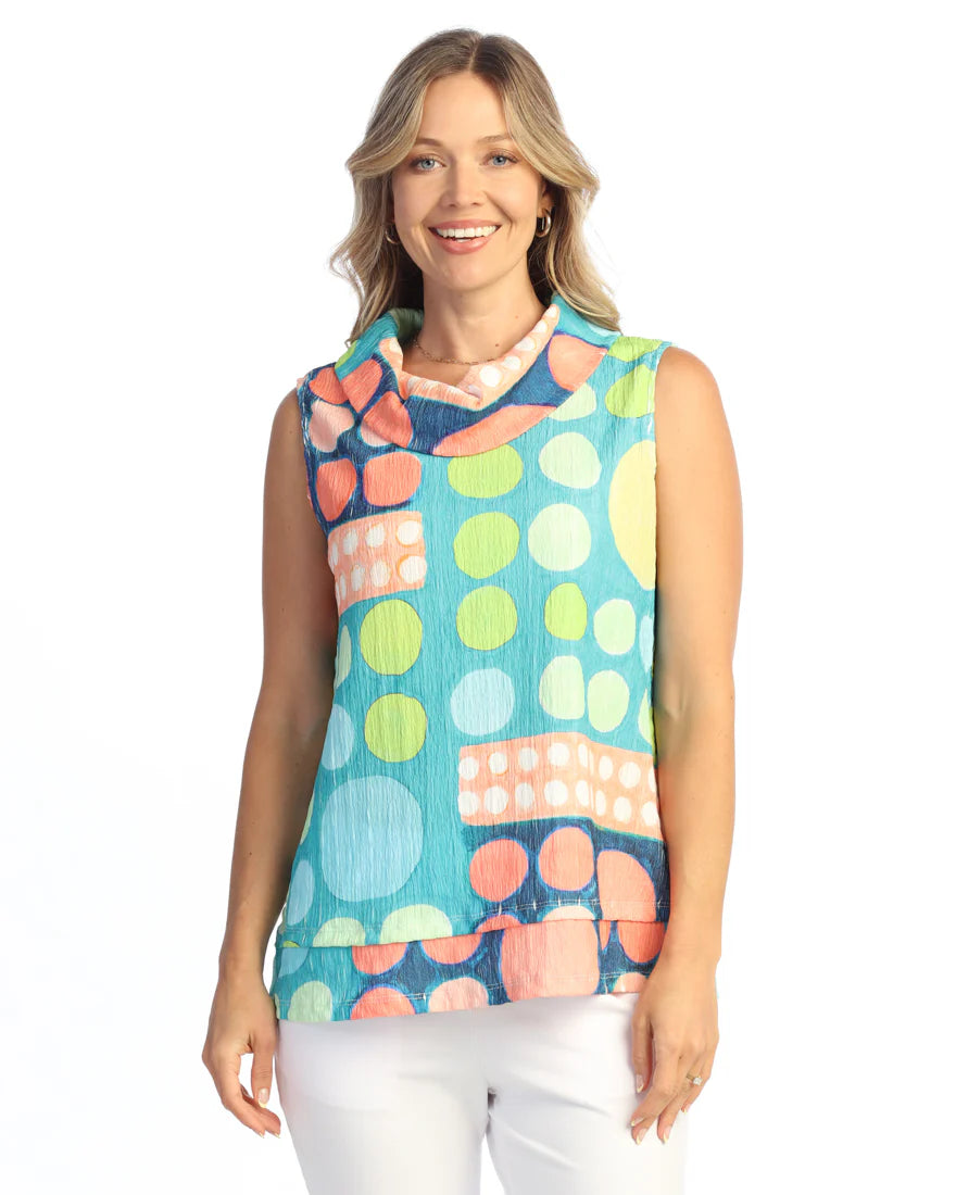 CRINKLE COWL NECK SLEEVELESS TOP WITH LAYERED HEM