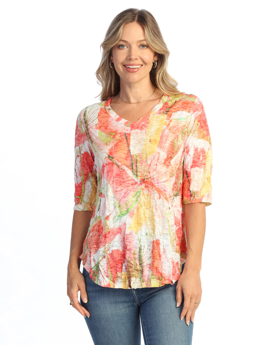 CRUSHED V-NECK HALF SLEEVE TOP WITH ROUND HEM