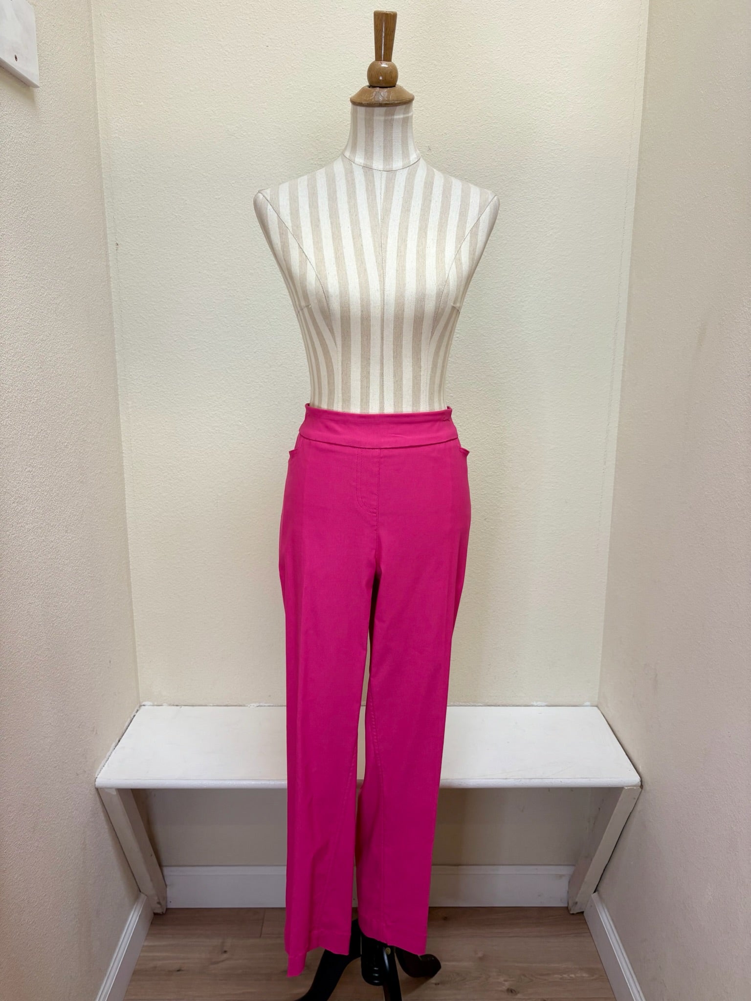 Sleek and chic, this feminine silhouette features an ankle leg with real front and back pockets. Crafted from our fine line twill - wrinkle resistant, super soft, lightweight, and stretchy fabric, it pairs perfectly for a professional polished look as well as an every day casual outfit. This style is a fashion color.