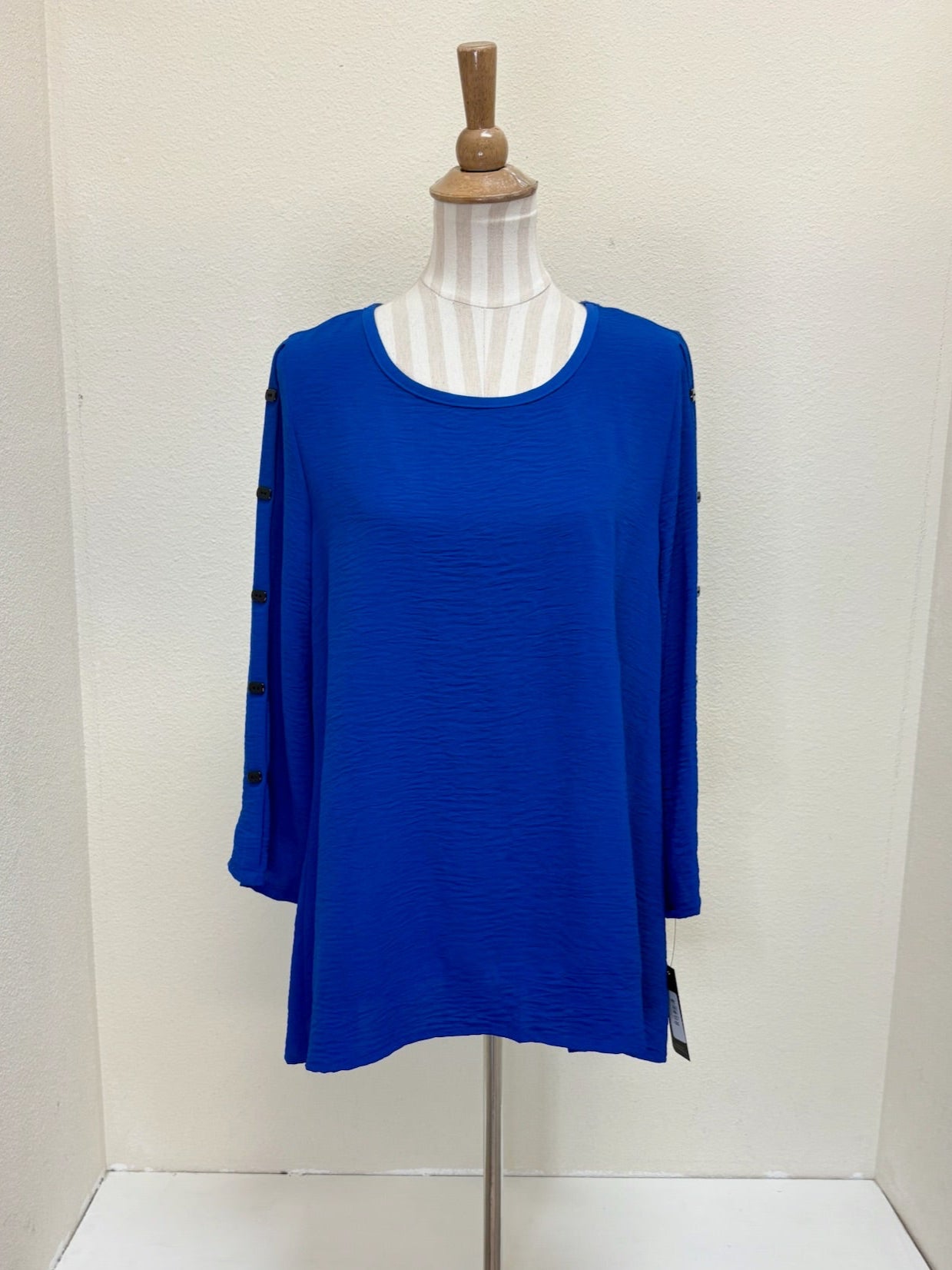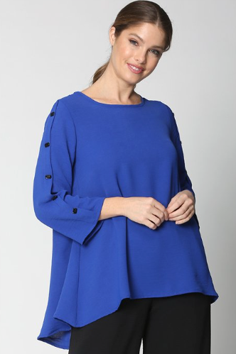 This top features button detailing on the sleeves and a pleated back. This top is shorter in the front and longer in the back.