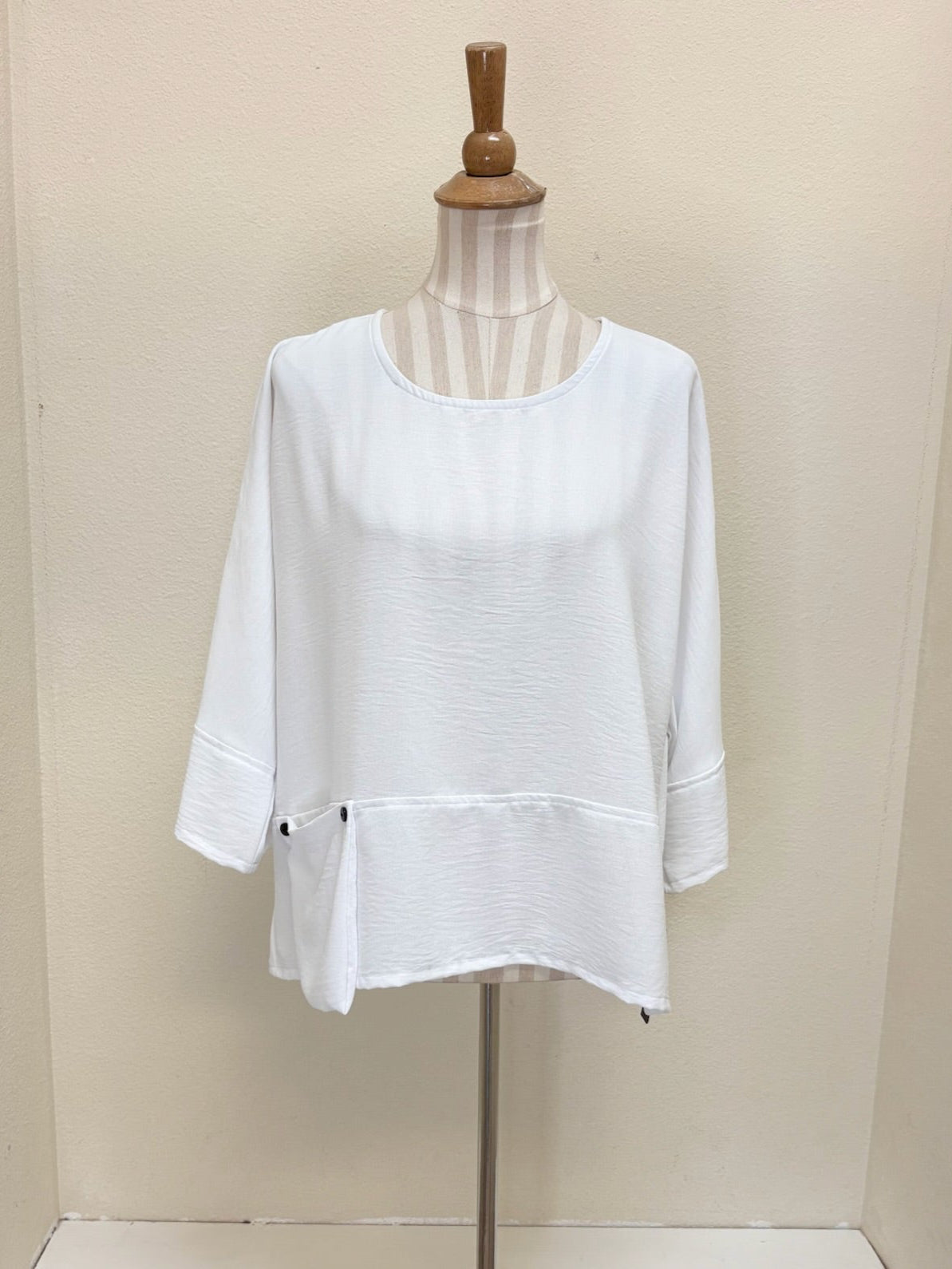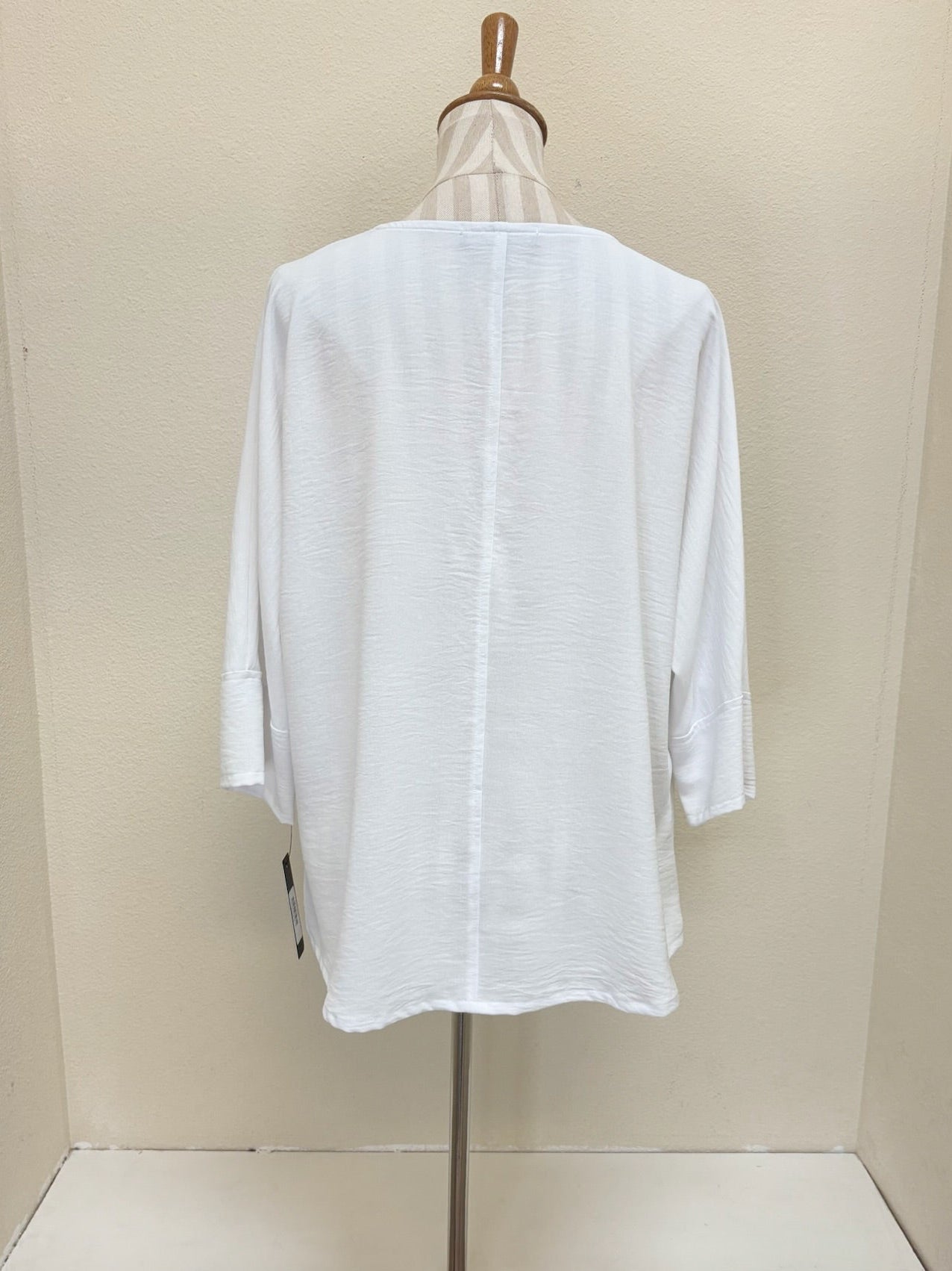This top features button detailing on the sleeves that is shorter in the front and longer in the back.