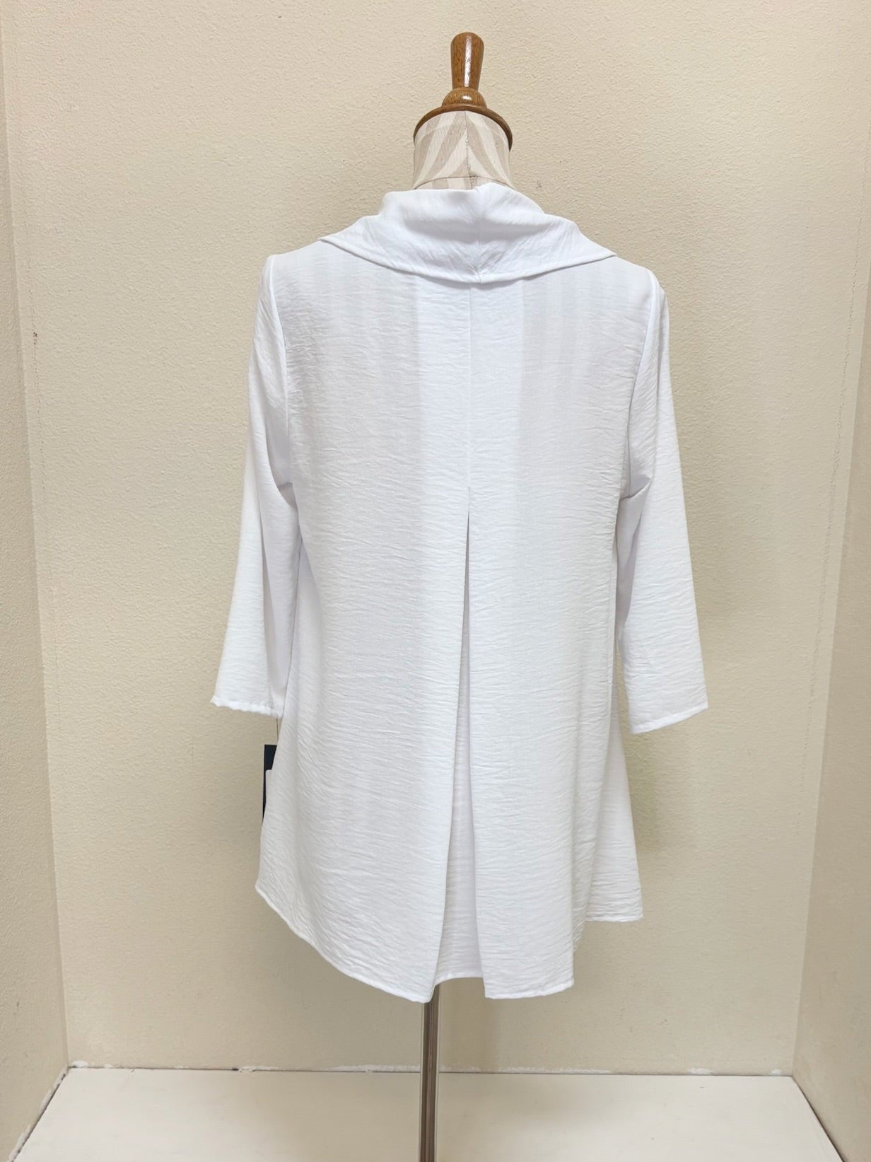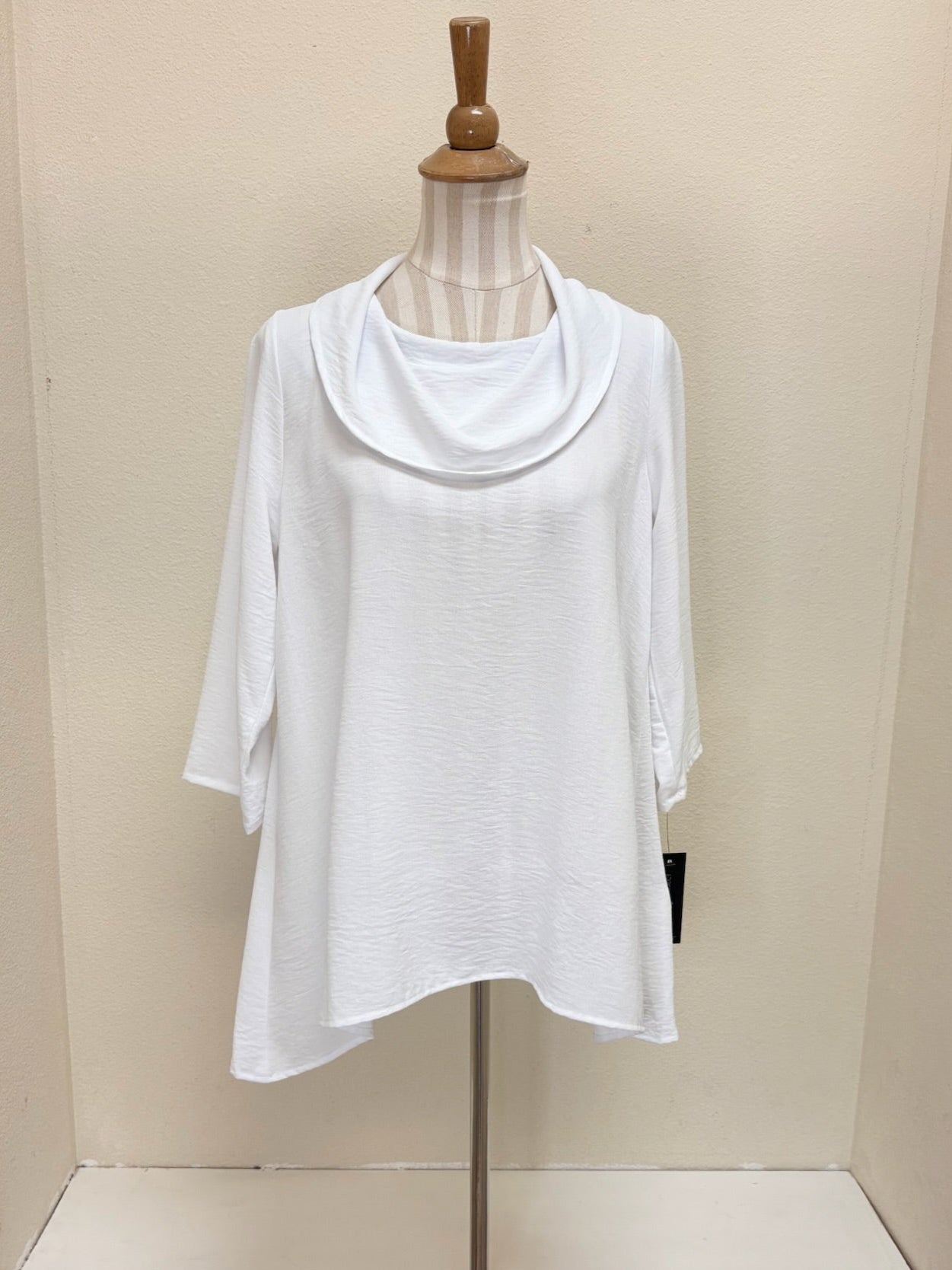 This top features a loose neck cowl top with 3/4 sleeves with small slits on the sleeves. and an abstract print.
