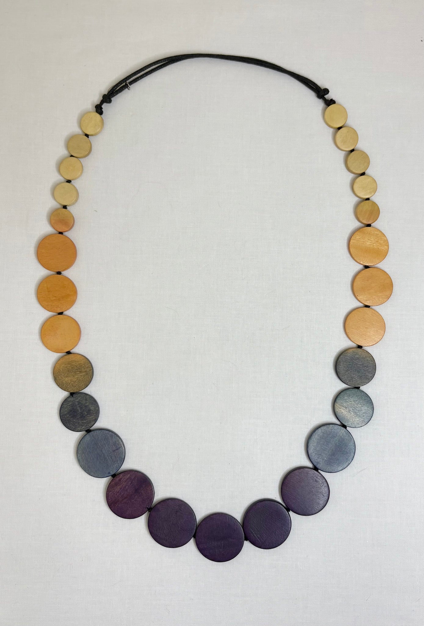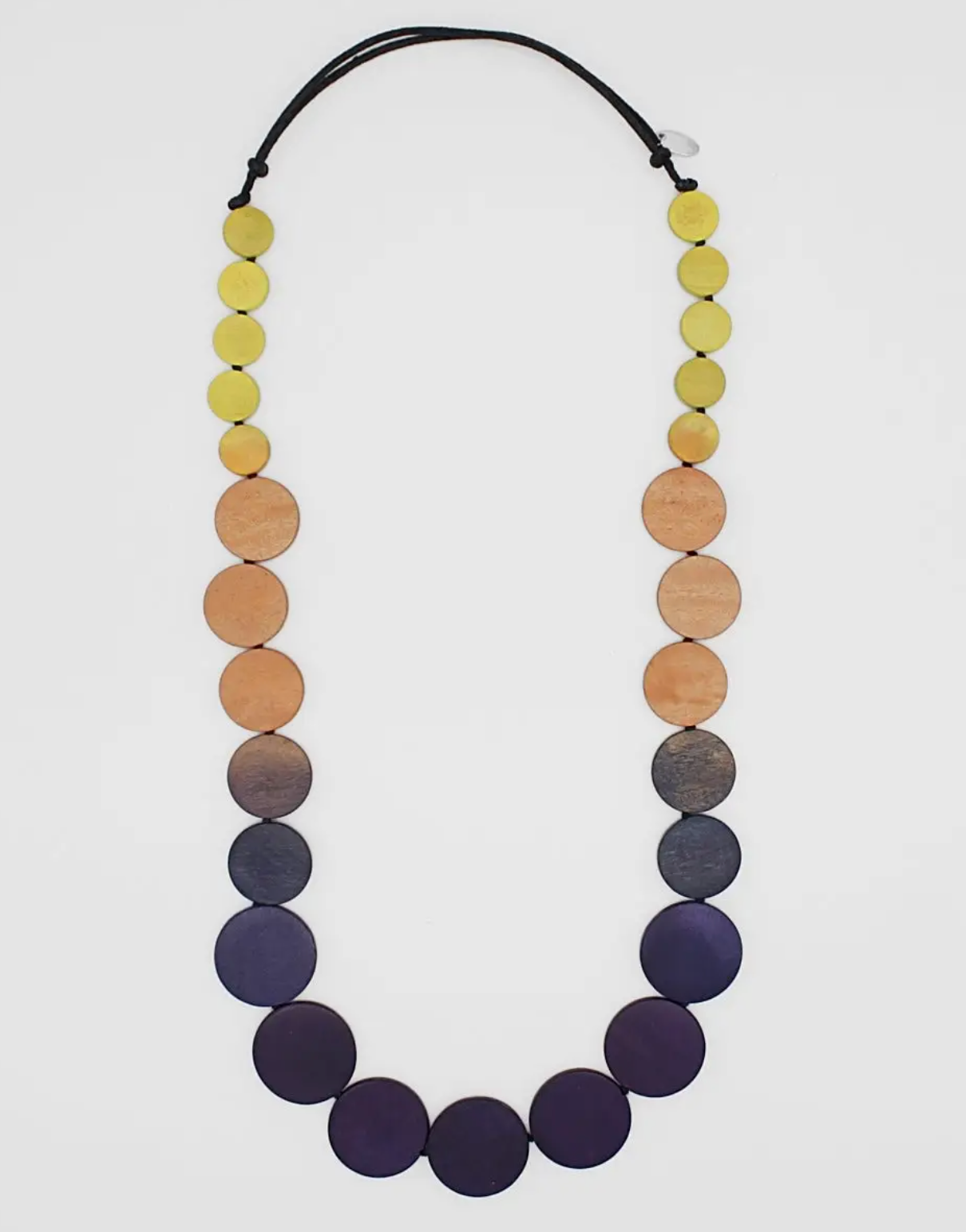 We love this timeless and stylish City Sunset Bead necklace from Sylca Designs. This lightweight and adjustable necklace features beautiful ombre-colored wooden beads from purple to yellow, arranged from small to large in a sophisticated and stylish look. Its simple design and contrast of colors makes it perfect for everyday wear and adds an aura of elegance to any outfit. Embrace the beauty of the city sunset and show off your unique style with this amazing accessory.