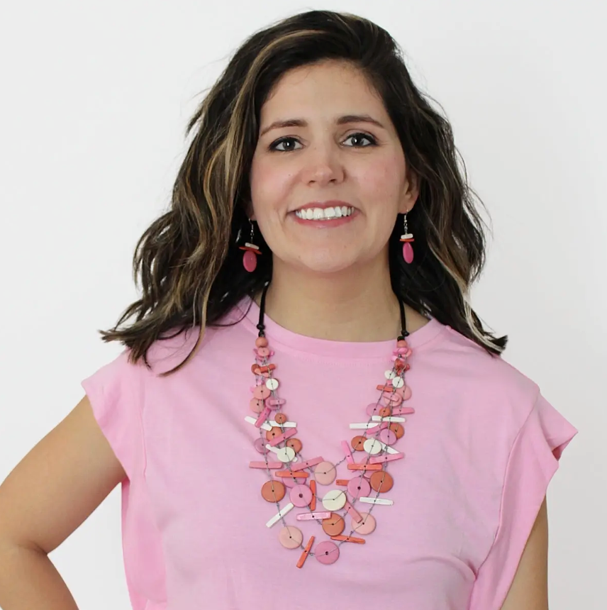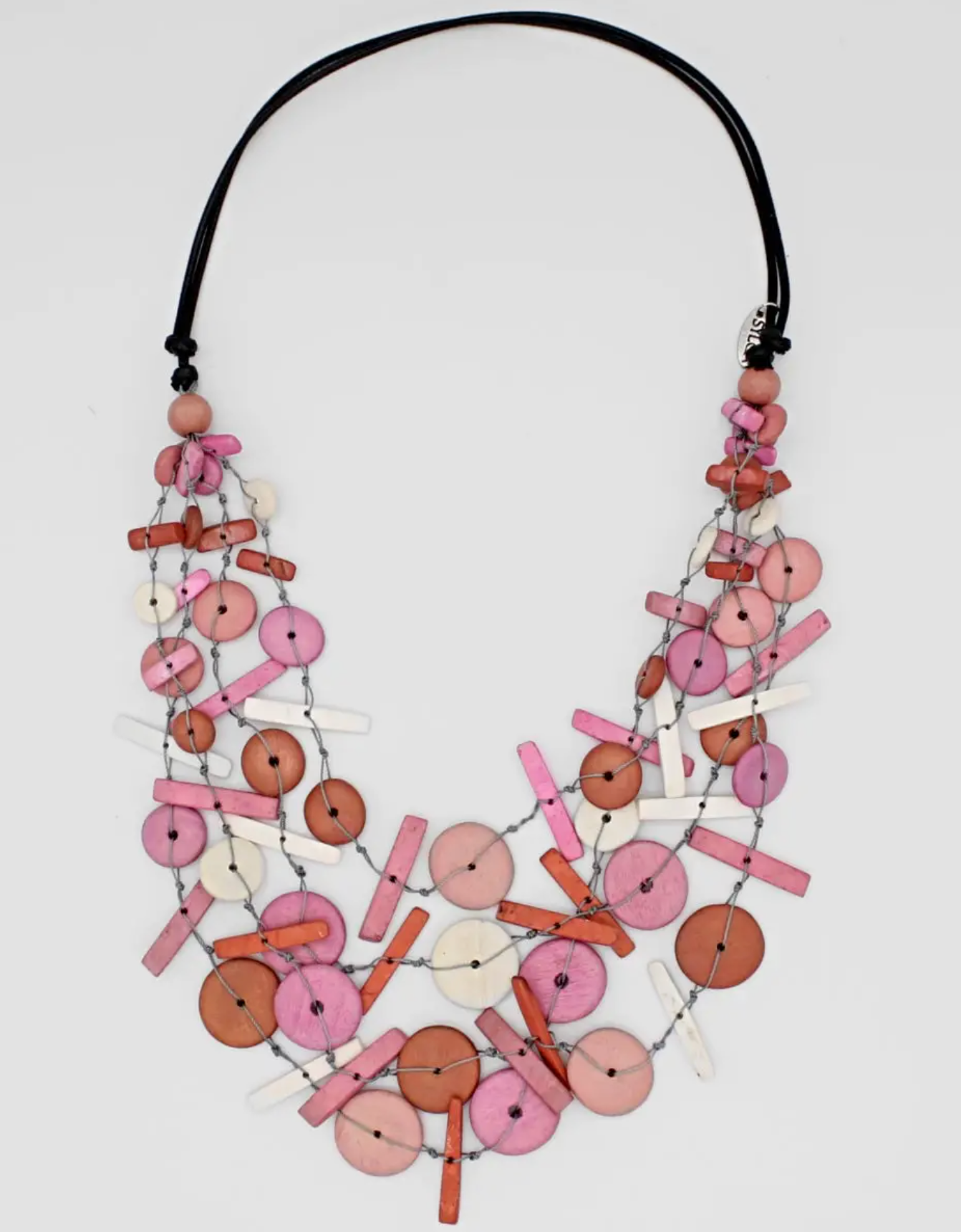 A dainty necklace made for fun or high fashion; this multi strand, adjustable necklace features a fun color way of coral, pink, and ivory on a black wax cord. Thin wood beads are strung on a thin clear wire making this necklace ultimately weightless. For an everyday look wear this necklace with a basic tee and jeans or dress it up with a cocktail dress and heels! Complete your look with the coordinating earrings.