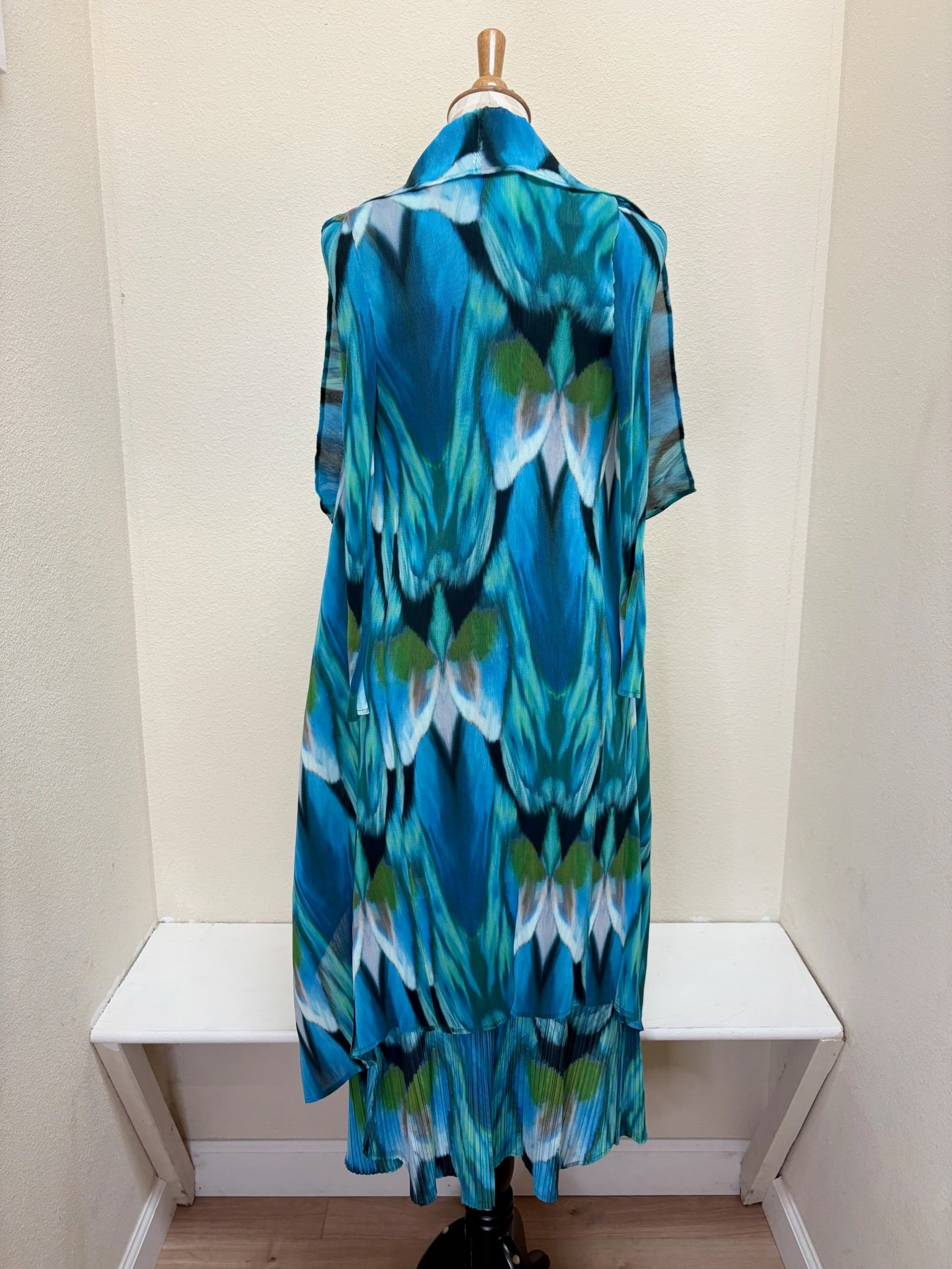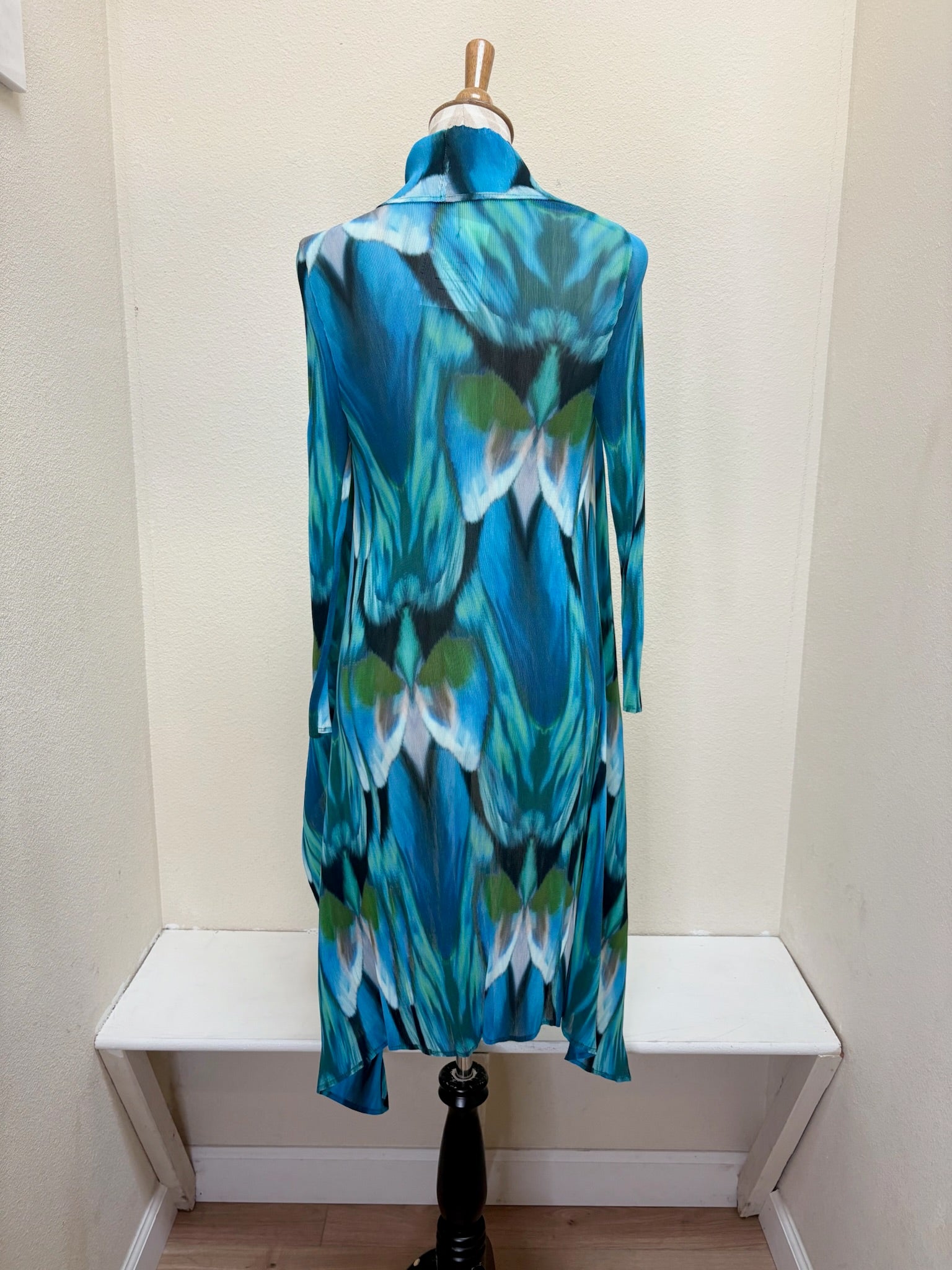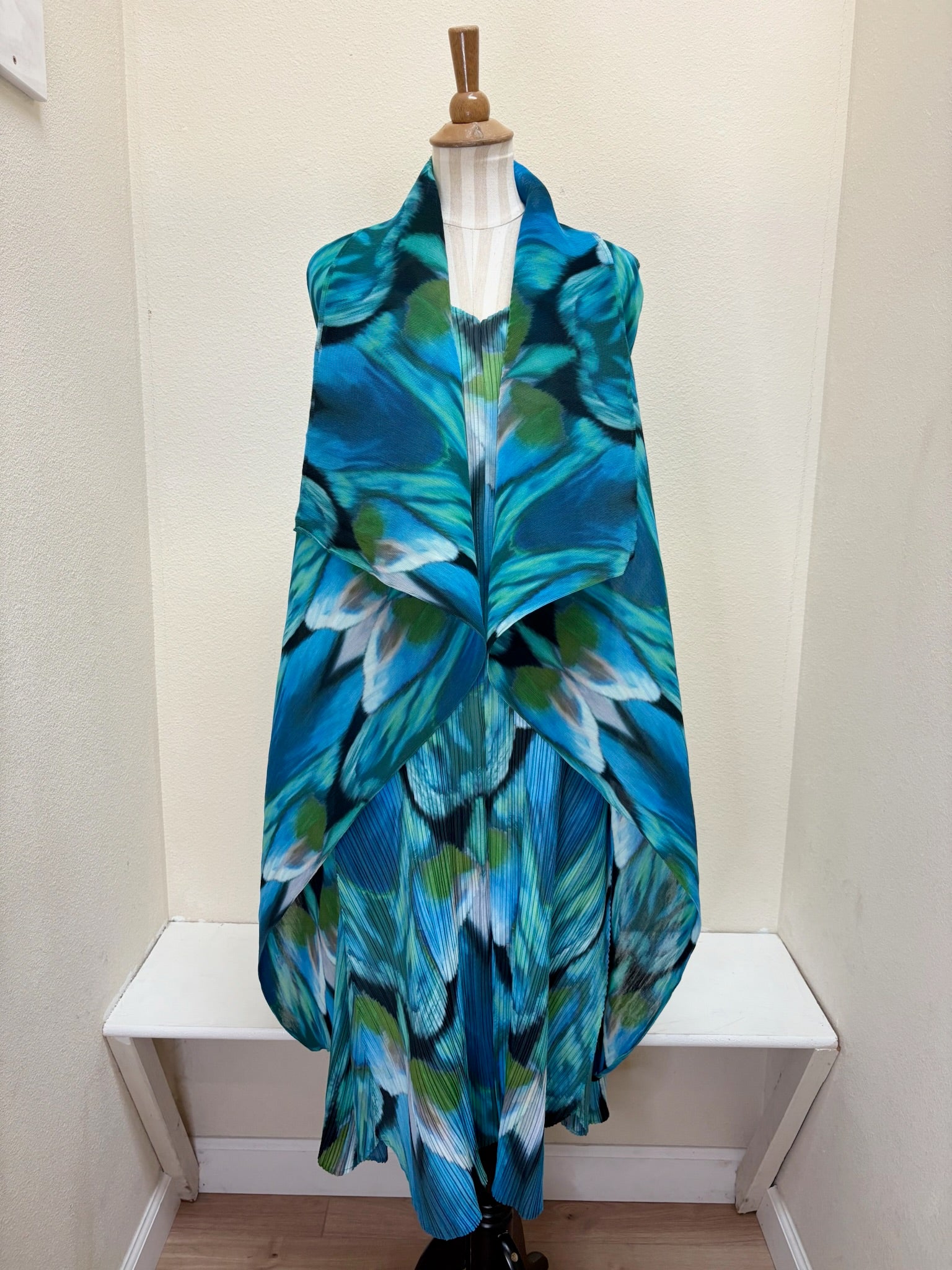 The Collare Coat is reminiscent of a waterfall. The beautiful pleated folds created within the chiffon material make it an easy to wear Alquema piece.