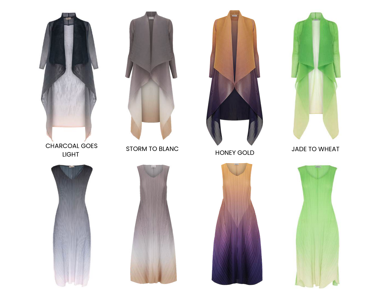 The Collare Coat is reminiscent of a waterfall. The beautiful pleated folds created within the chiffon material make it an easy to wear Alquema piece and is perfectly paired with the Long Estrella Dress.