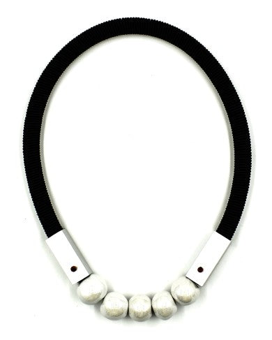 A brilliant design and a classic chic look: 22" long with ceramic pearls and aluminum accent. No clasp, thanks to an elastic system underneath the pearls.