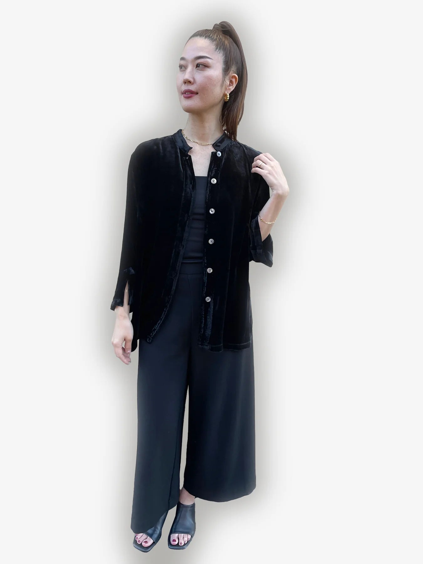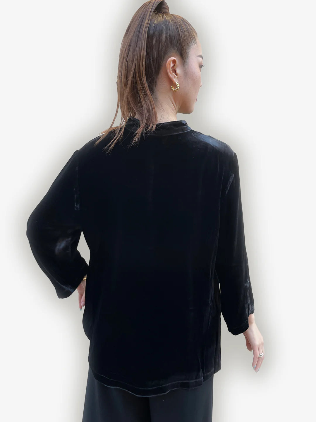 Citron classic blouse in Soft and Luxurious pre-washed Silk Blend velvet fabrication. 3/4 sleeves with a slit, mandarin collar and side slits. Shell buttons. Wear it as a top or a light jacket.