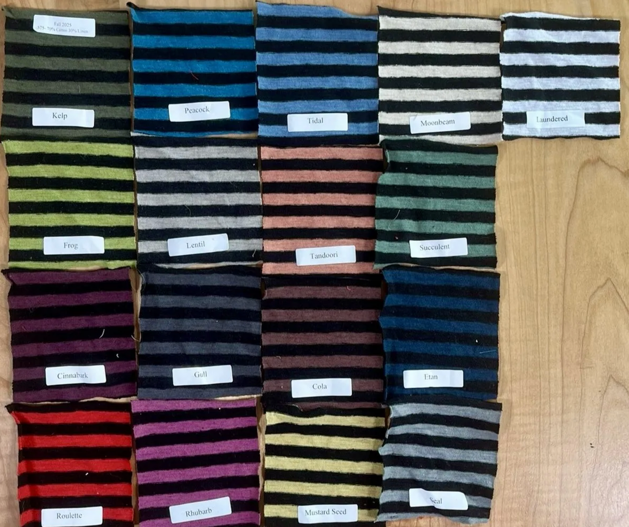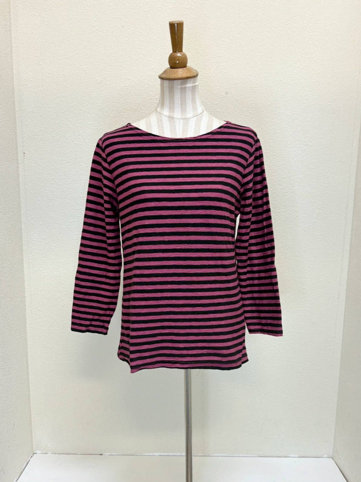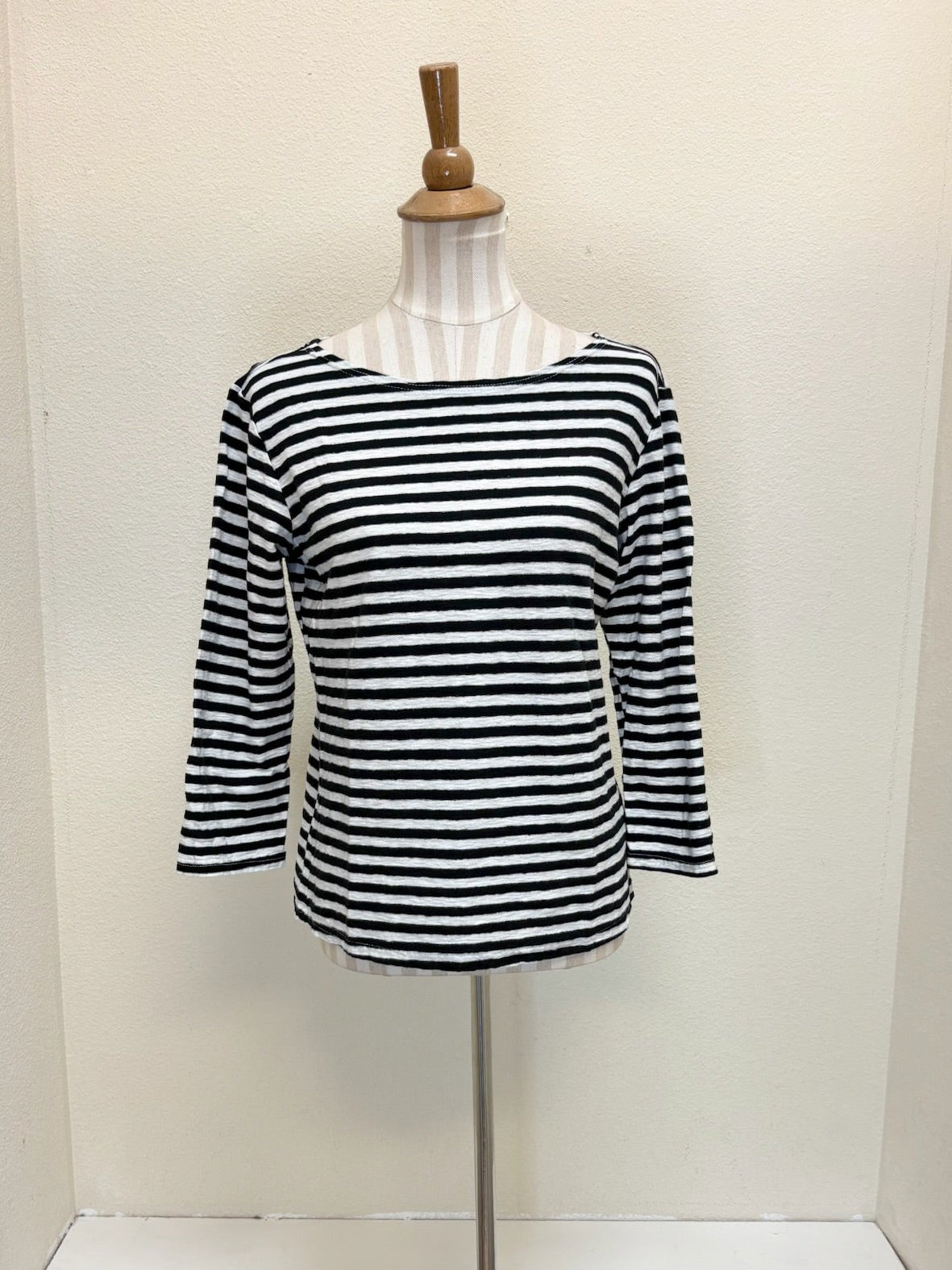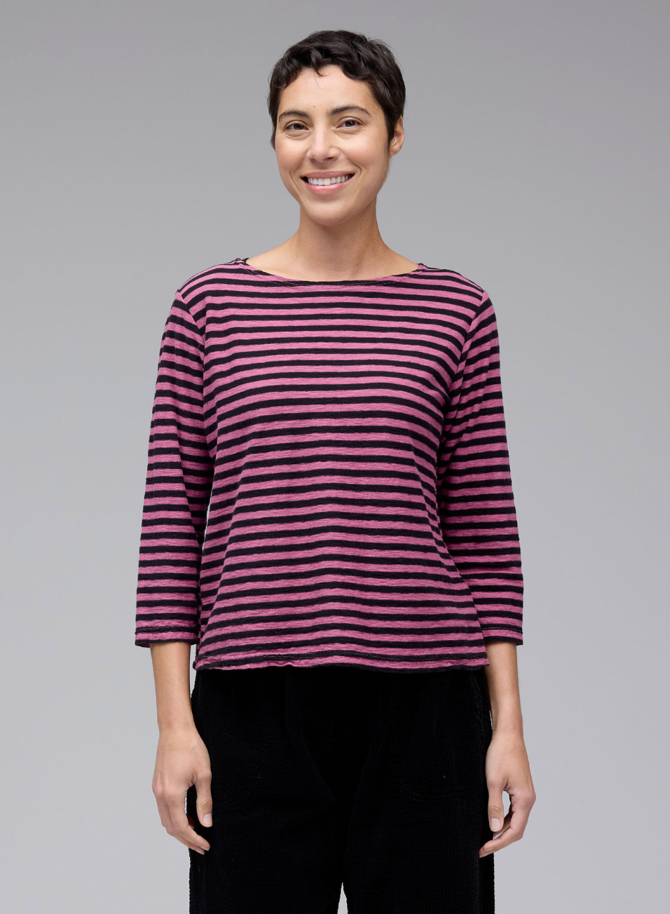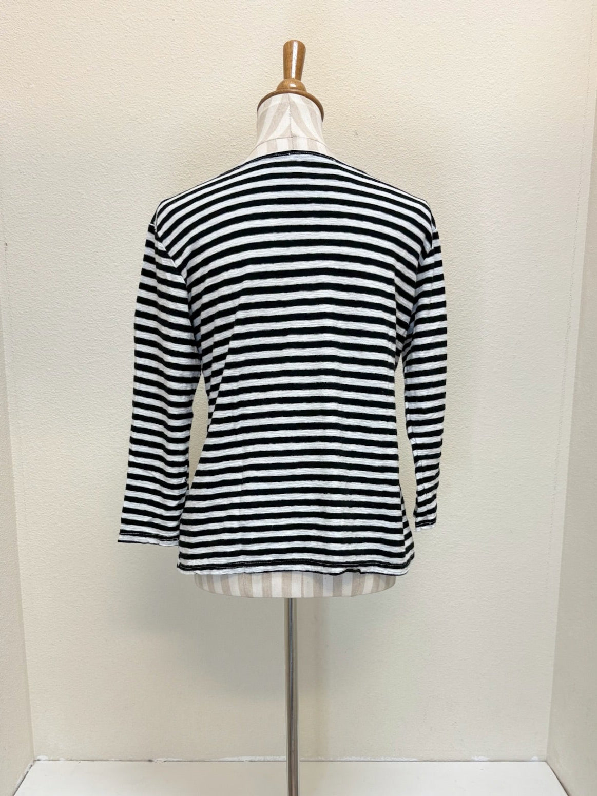 Cut Loose - your "go-to" pieces! A returning fabric and design! This black stripe tee features a boatneck, 3/4 sleeves and a straight hem. Made from cotton/linen jersey, it is soft and comfortable. A perfect layering piece!