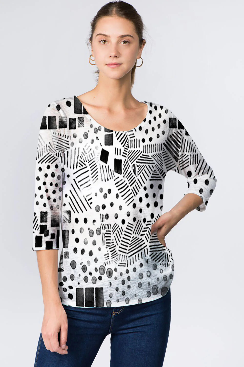 This black & white geometric print is the perfect pattern to dress up or down for endless outfit possibilities. Featured in the Et Lois Fiona body, this top creates a flattering and comfortable fit with a 3/4 sleeve length and classic scoop neck style. Don’t miss out on this incredible addition to your wardrobe!