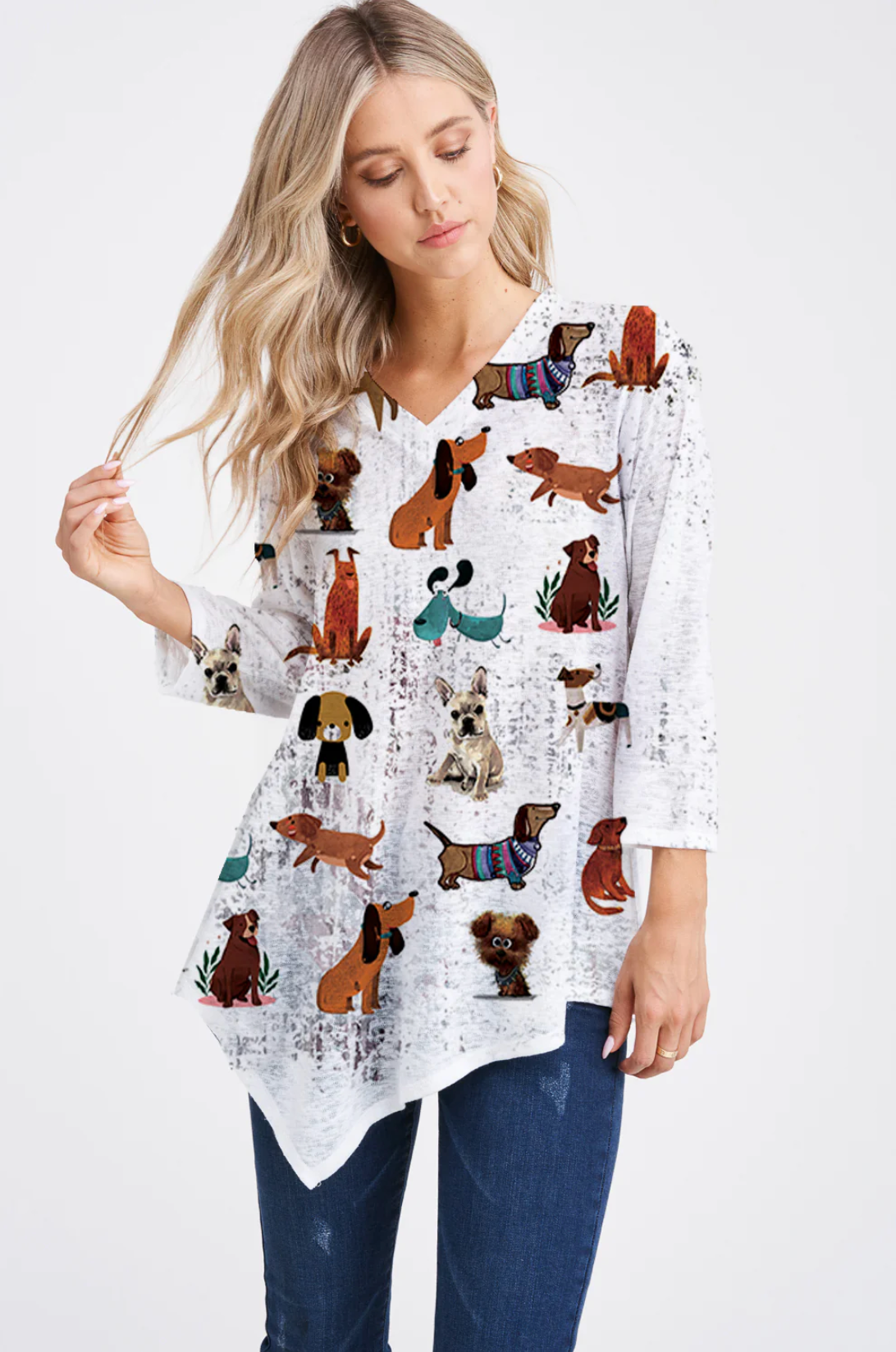 This graphic animal friend print is the perfect new addition to your wardrobe. Featured in the Et Lois Moon body, this top creates a flattering and comfortable fit with a 3/4 sleeve length, v-neck style and asymmetrical hemline. Don’t miss out on this incredible addition to your wardrobe!
