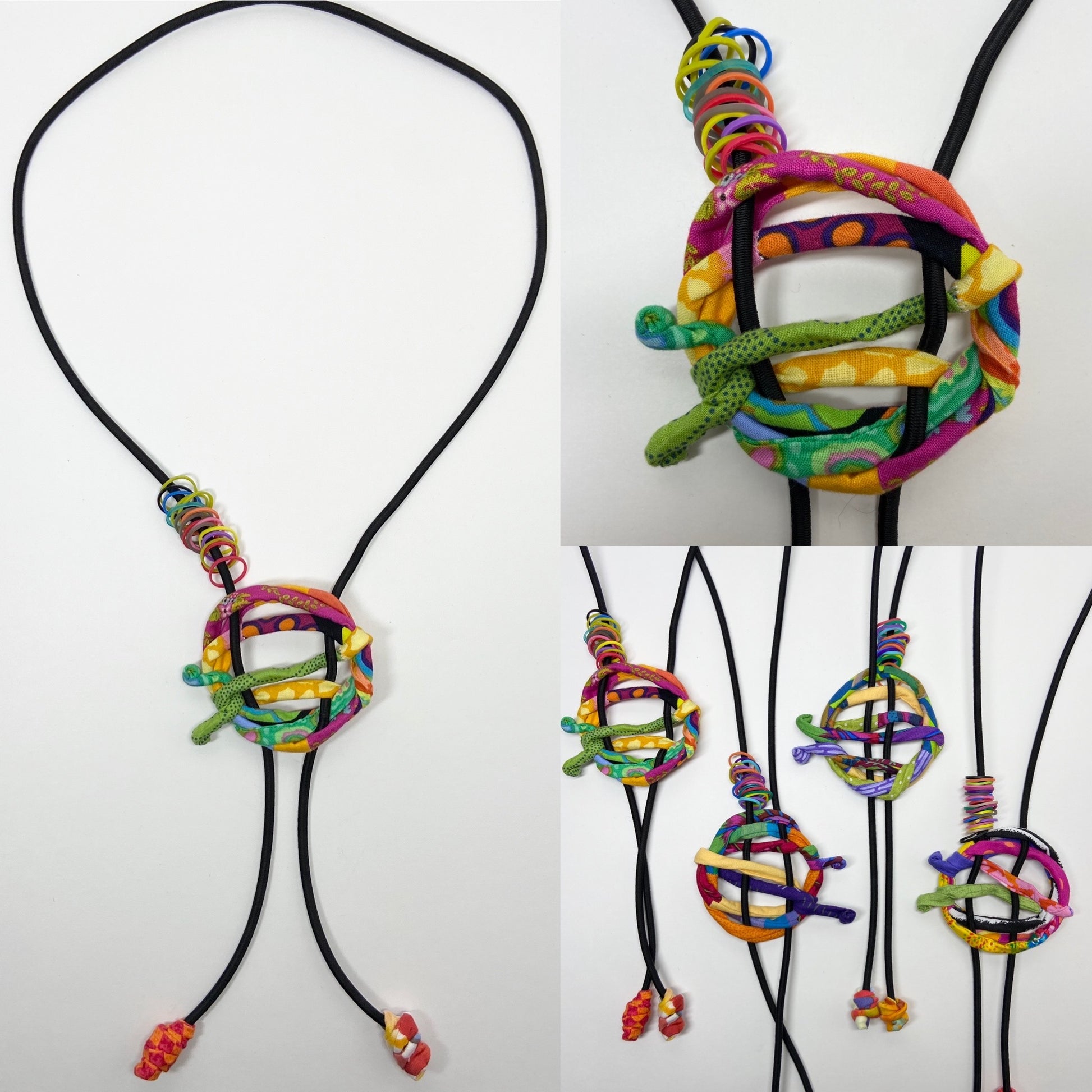 The Buckle Bolo has arrived! This fun and playful necklace has up to 6 different fabrics and a bunch of tiny, colorful silicone bands. The Buckle slides up and down on a black, bungee cord base, and each tip is finished with coordinating ‘feet’ that compliment the Buckle! We just love how the tiny bands move up and down the neck cord!