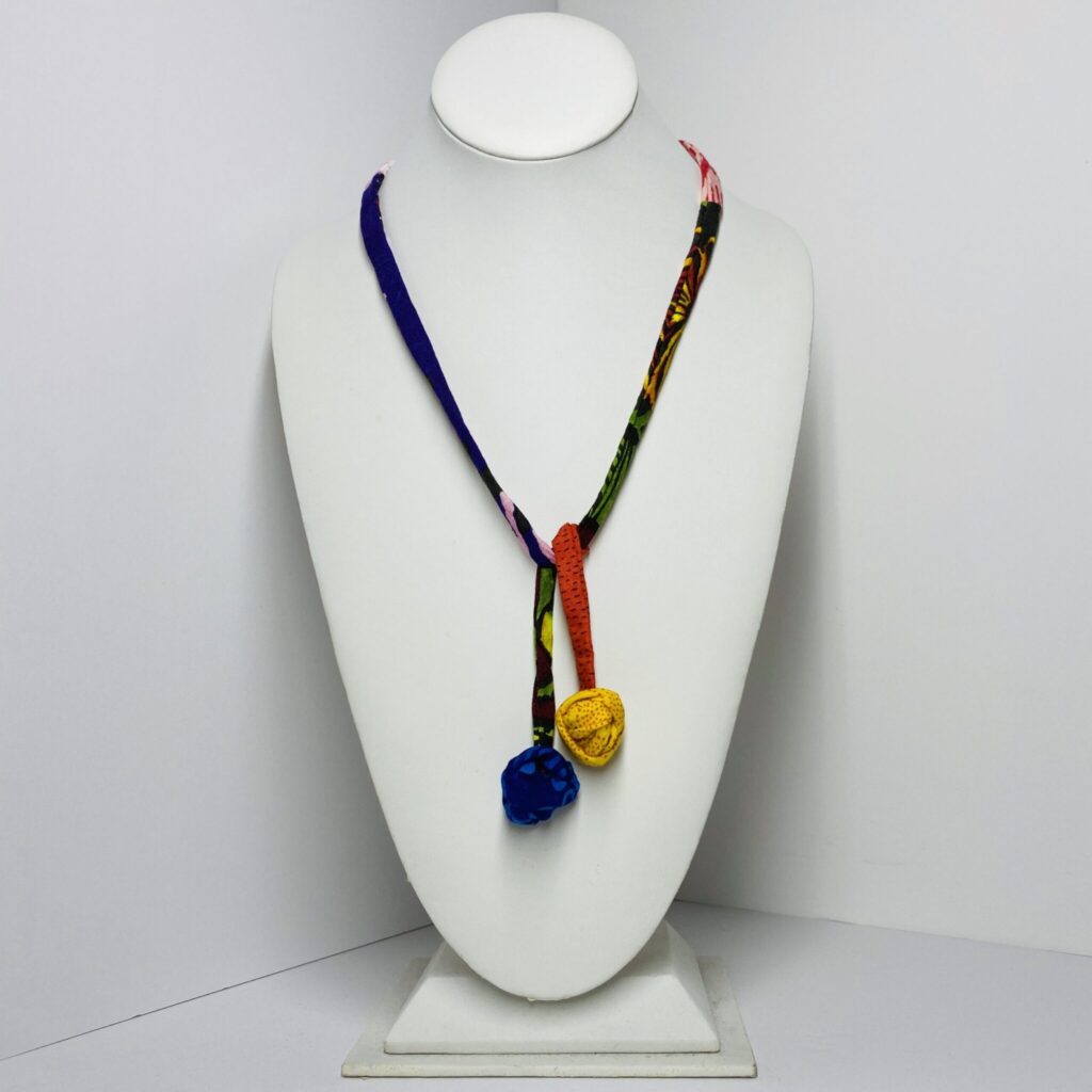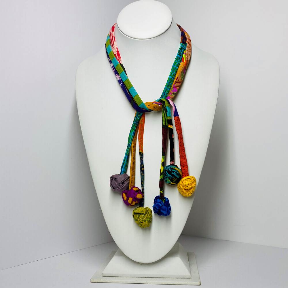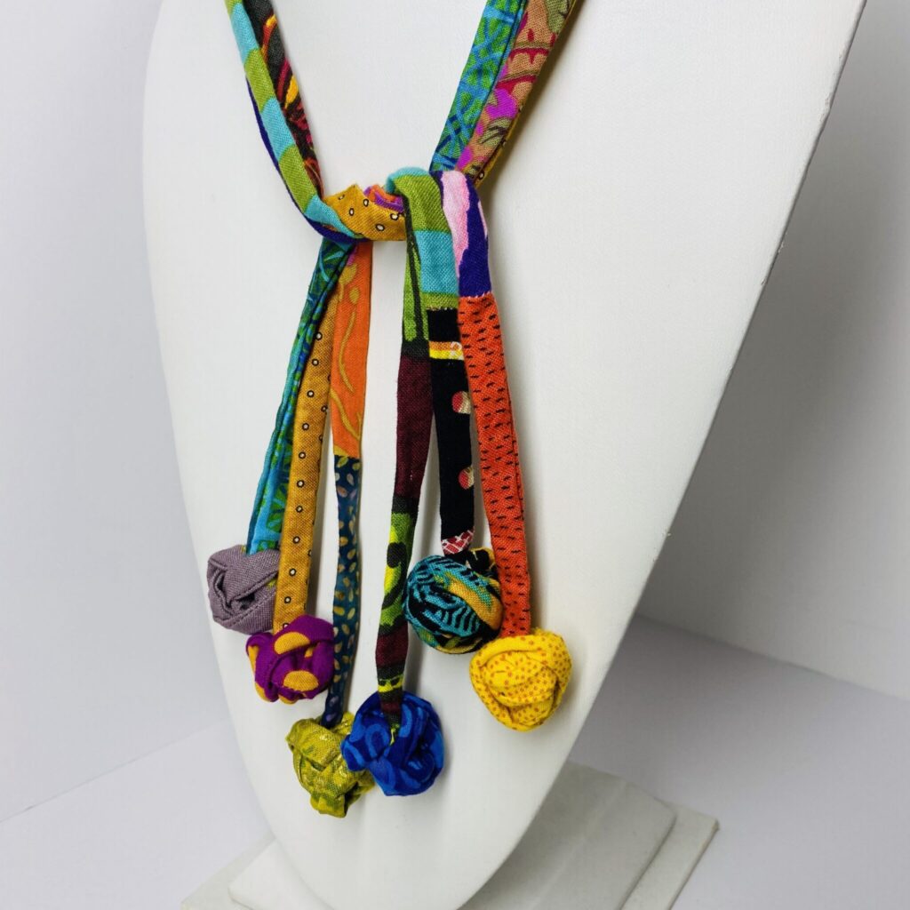 These bolos were named “Cherry Strings” by Kati Koos in San Francisco – works for me! Various fabrics are stitched together and finished with a big Cherry ball on each end! Wear one or more around your neck for a warm-season scarf. Use as a belt, or wrap around wrists, use as a hair piece, etc.