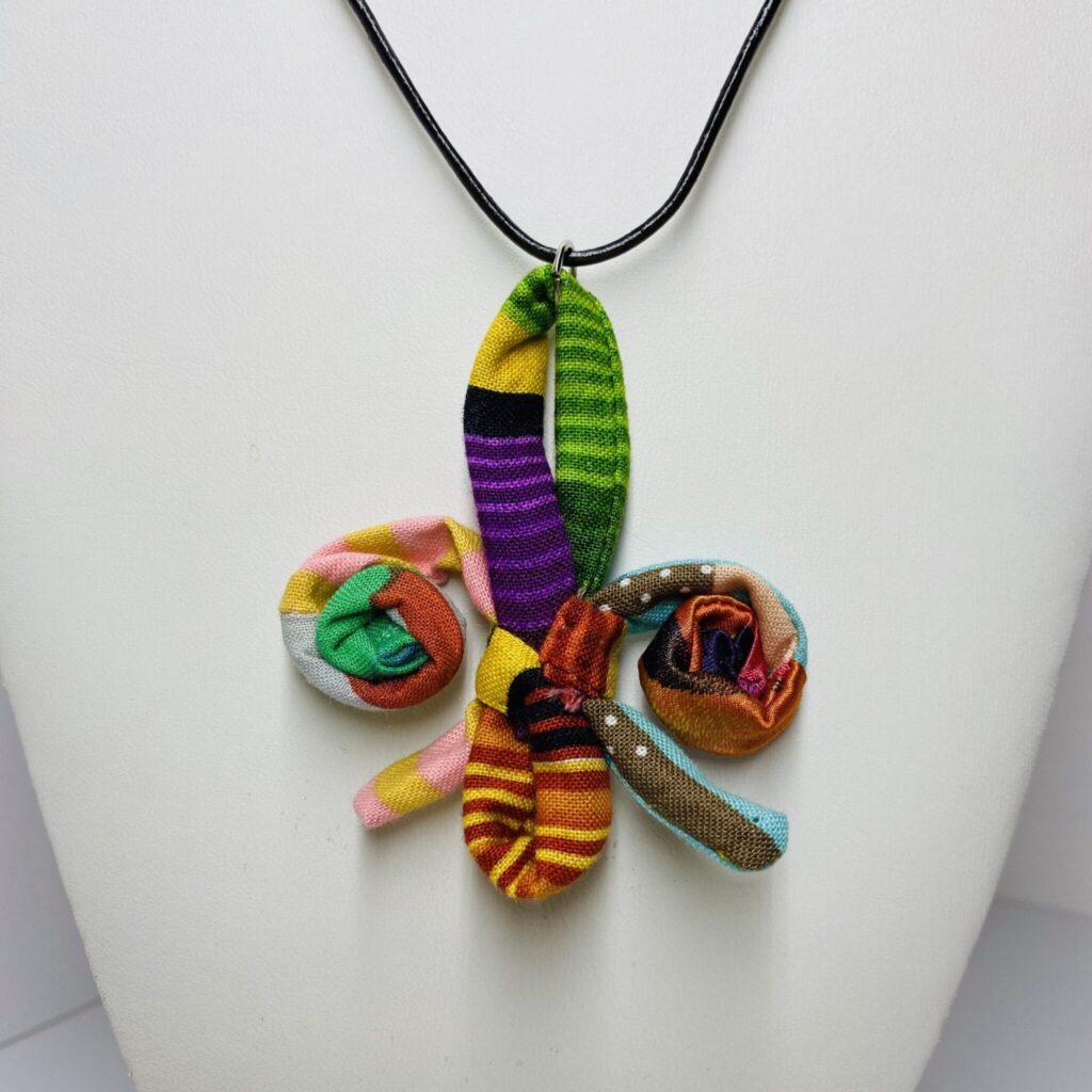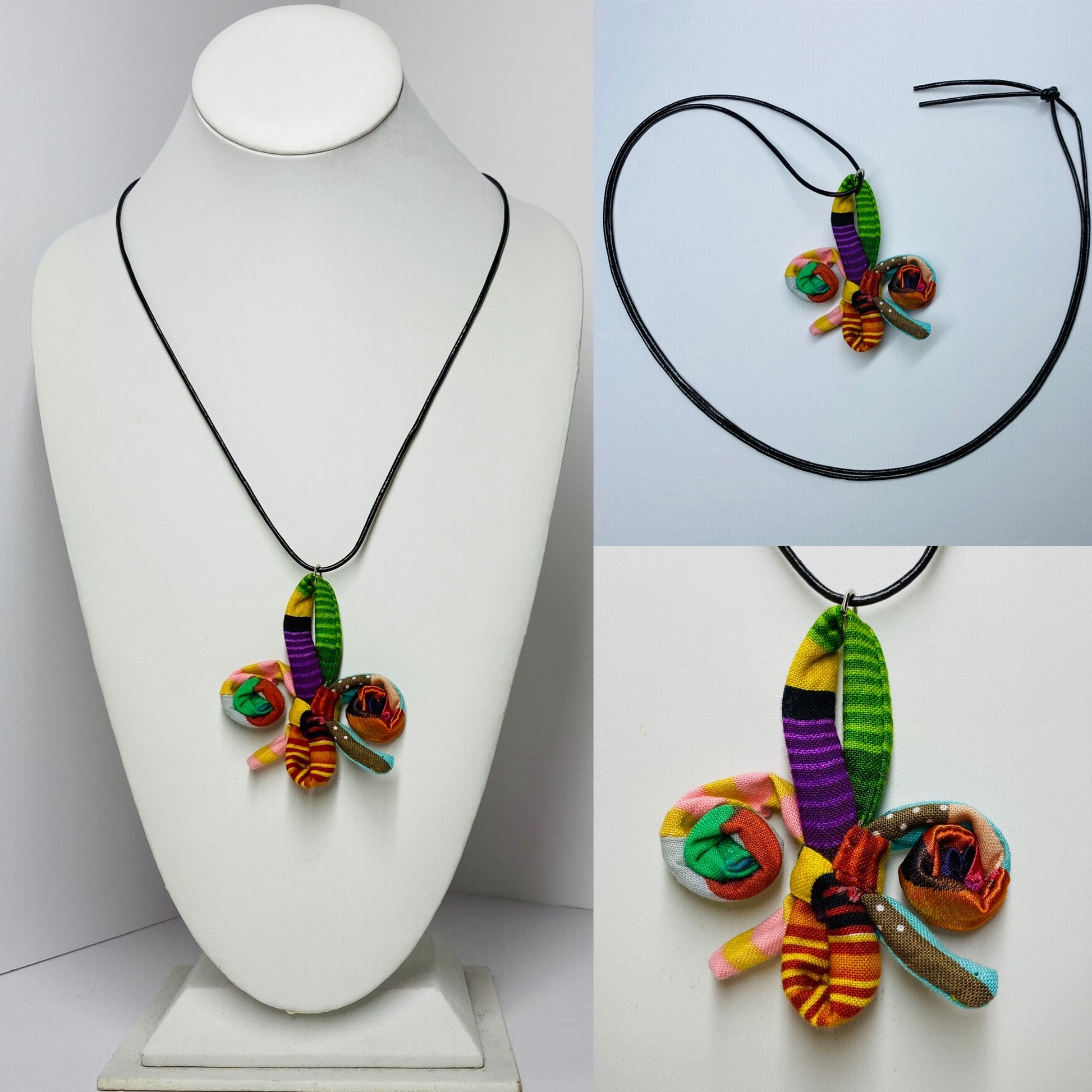 We have recreated a popular design for anybody who loves New Orleans, The Saints, or even all of France! Five fabrics are used to create the Ficklesticks, which are then bent and sewn into the fleurs. We hang the pendant from a thin, black cord. This small pendant is a great addition to any look!
