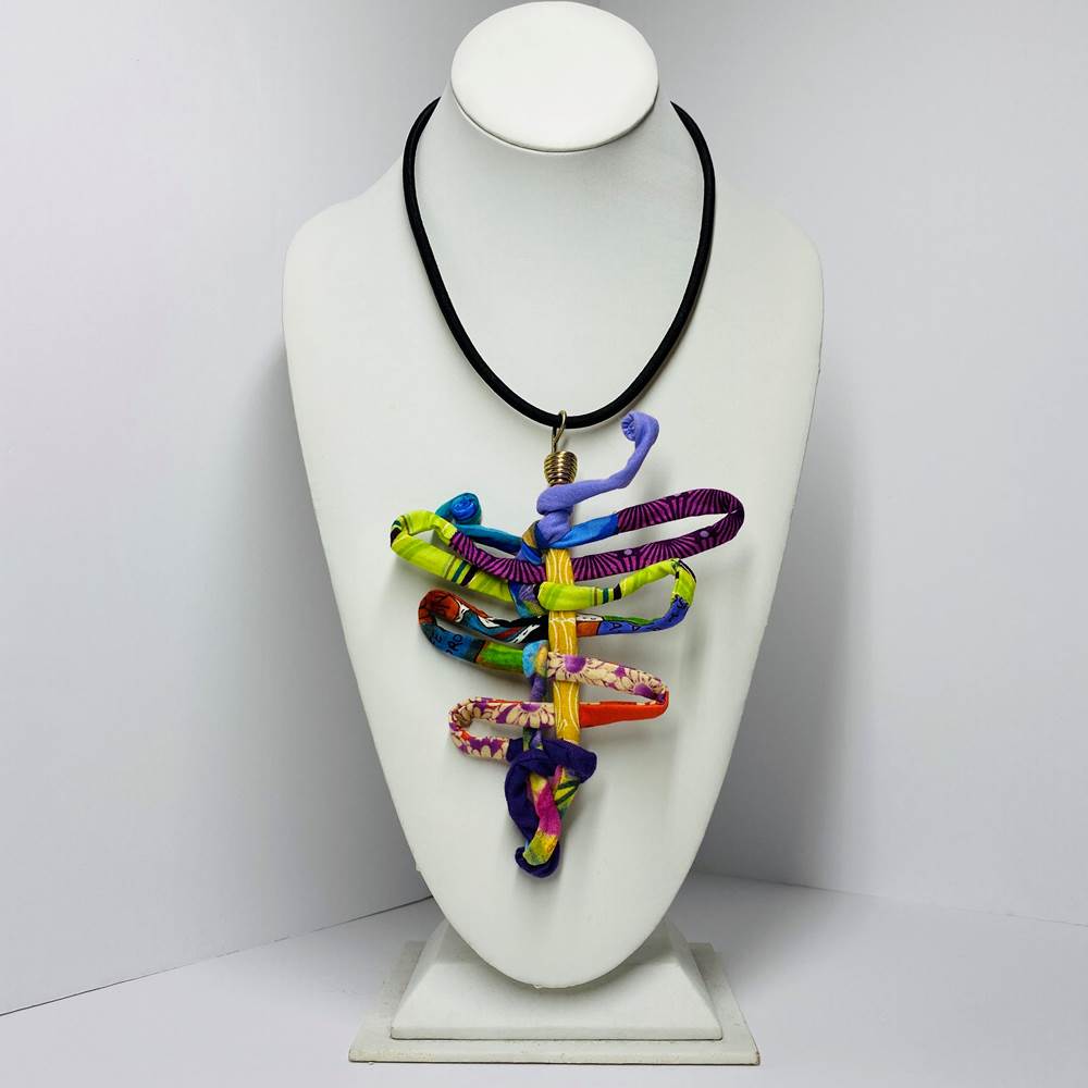 This Asian-inspired motif is a unique addition to any wardrobe! This loopy, architectural ‘necktie’ hangs from our house-made bungee cord, and has up to nine different fabrics!