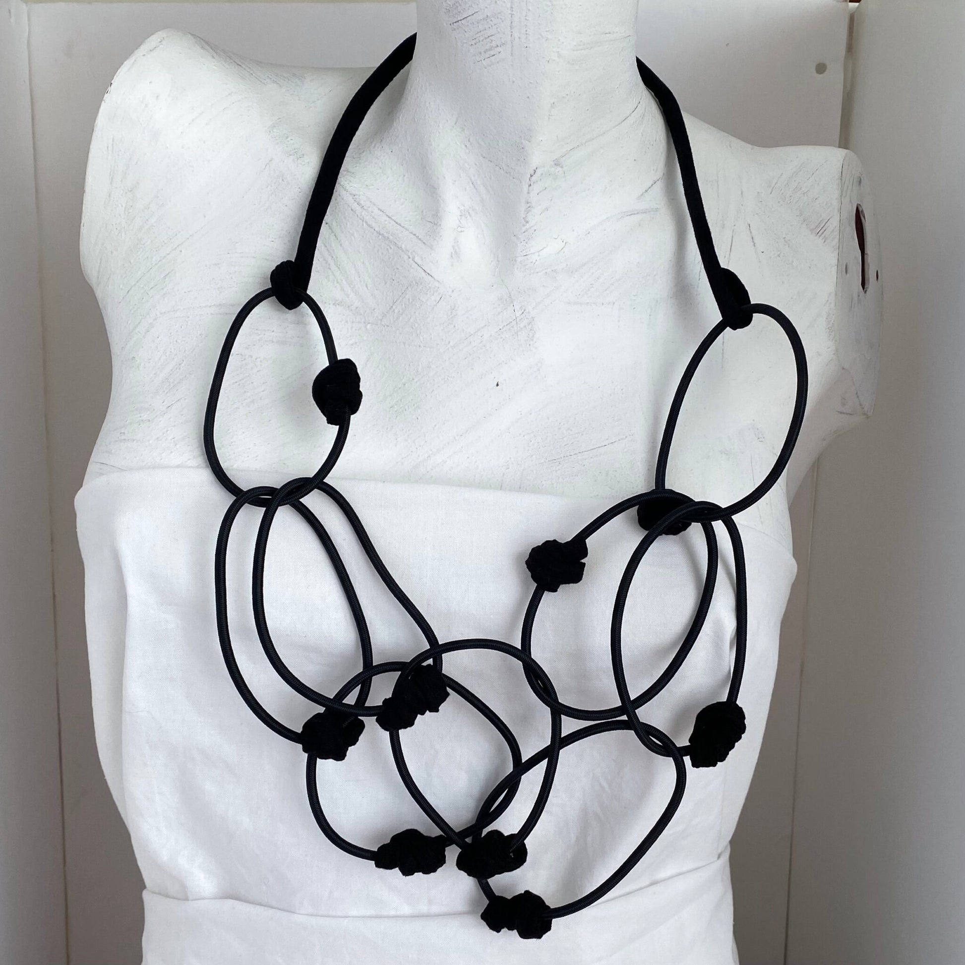 Ringo is a convertible necklace! It comes with a bendable back neck cord that can be removed, so you can wear the rings directly around your neck. Each of the nine bungee cord rings is adorned with a wrapped Ficklestick.