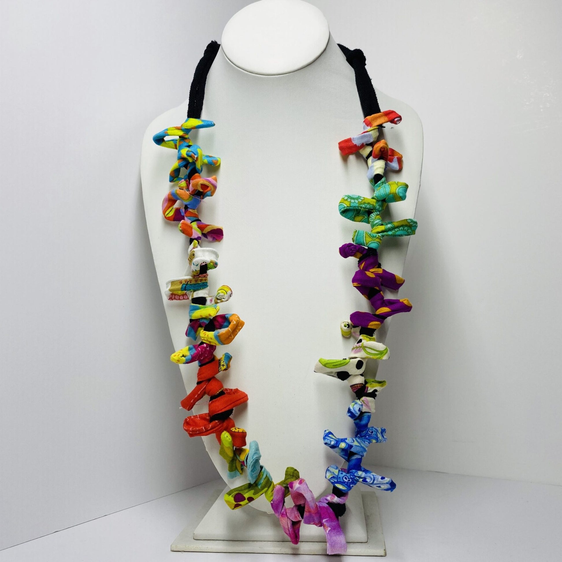 Inspired by our original Bottlebrush, this necklace features 12 beautiful fabrics arranged in small loops around a black base. In this version, we’ve swapped the fabric base for black cotton potholder loops. The wire inside allows the necklace to maintain its organic structure. Fastens with a Ficklesticks button closure in the back.