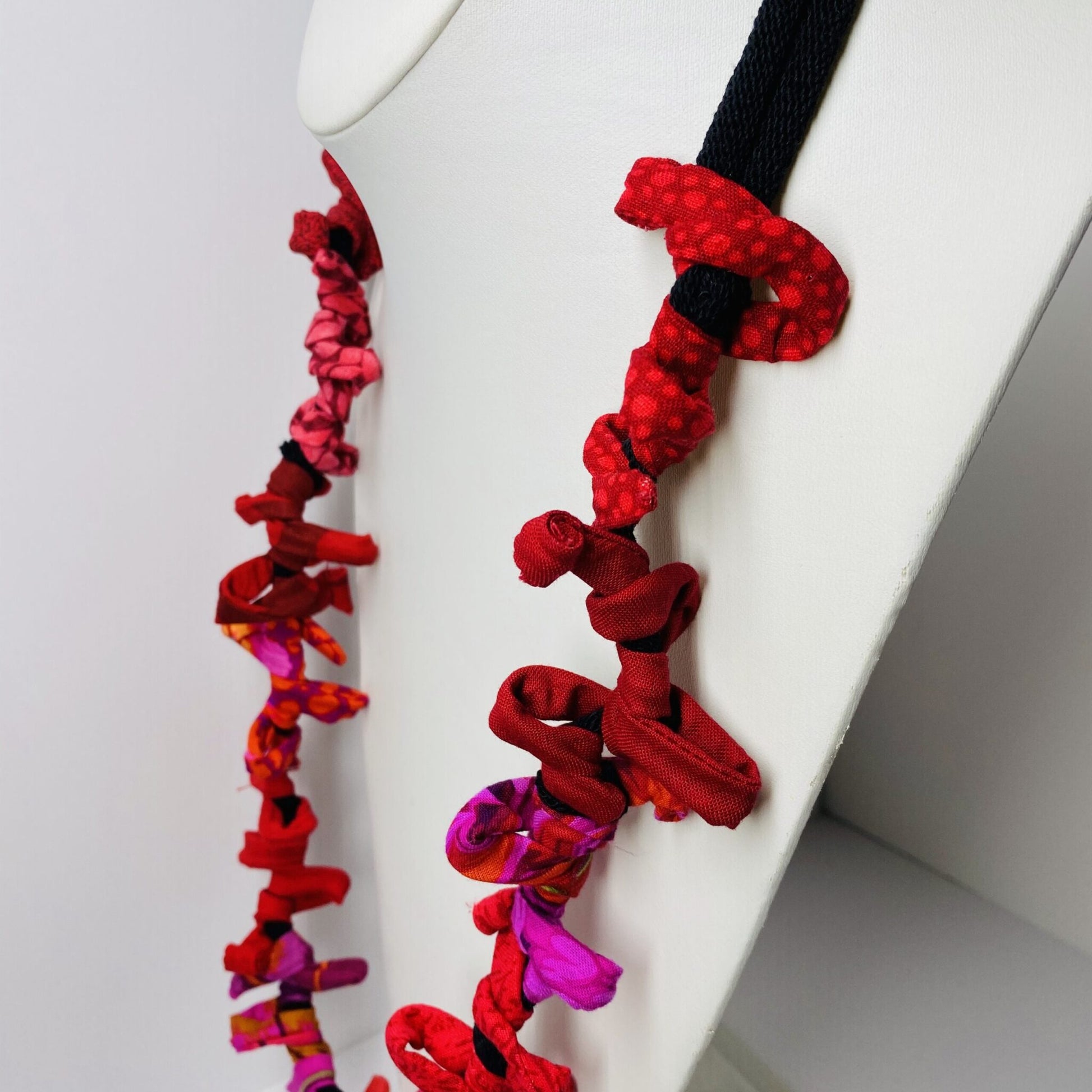 Inspired by our original Bottlebrush, this necklace features 12 beautiful fabrics arranged in small loops around a black base. In this version, we’ve swapped the fabric base for black cotton potholder loops. The wire inside allows the necklace to maintain its organic structure. Fastens with a Ficklesticks button closure in the back.
