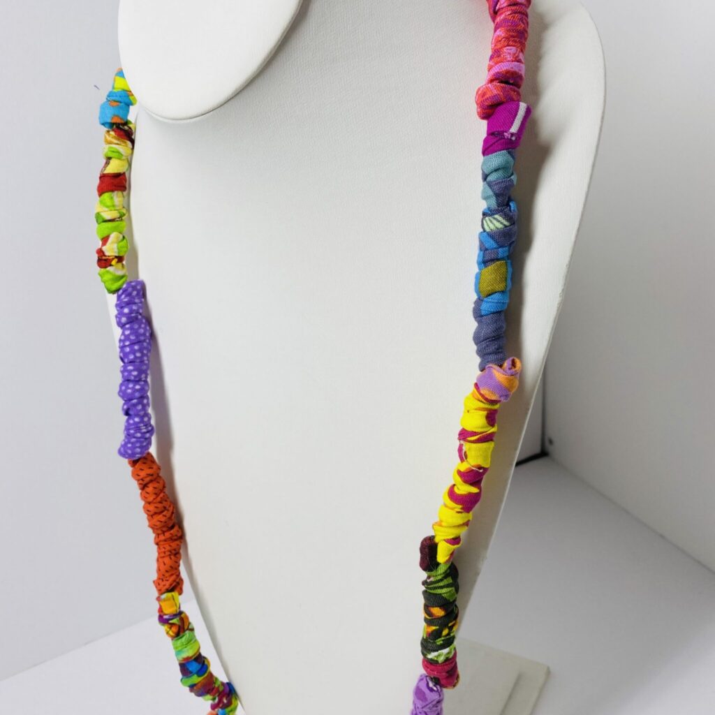 Twelve fabulous fabrics are made into Ficklesticks and then twisted into thin corkscrews! The wire inside each fabric tube holds the shape, and the corkscrews are strung onto a thin, black cord. Sleek enough to go with any style!