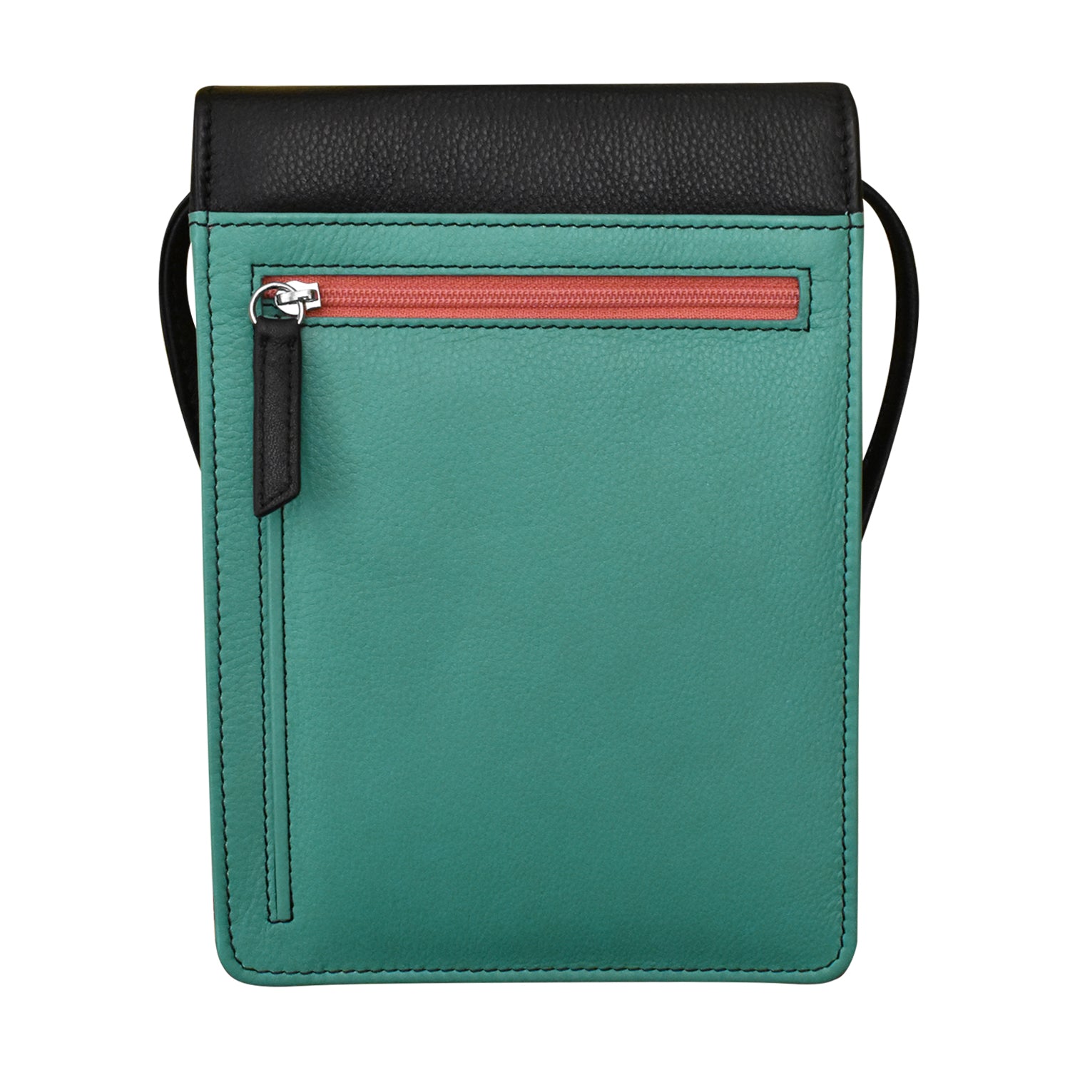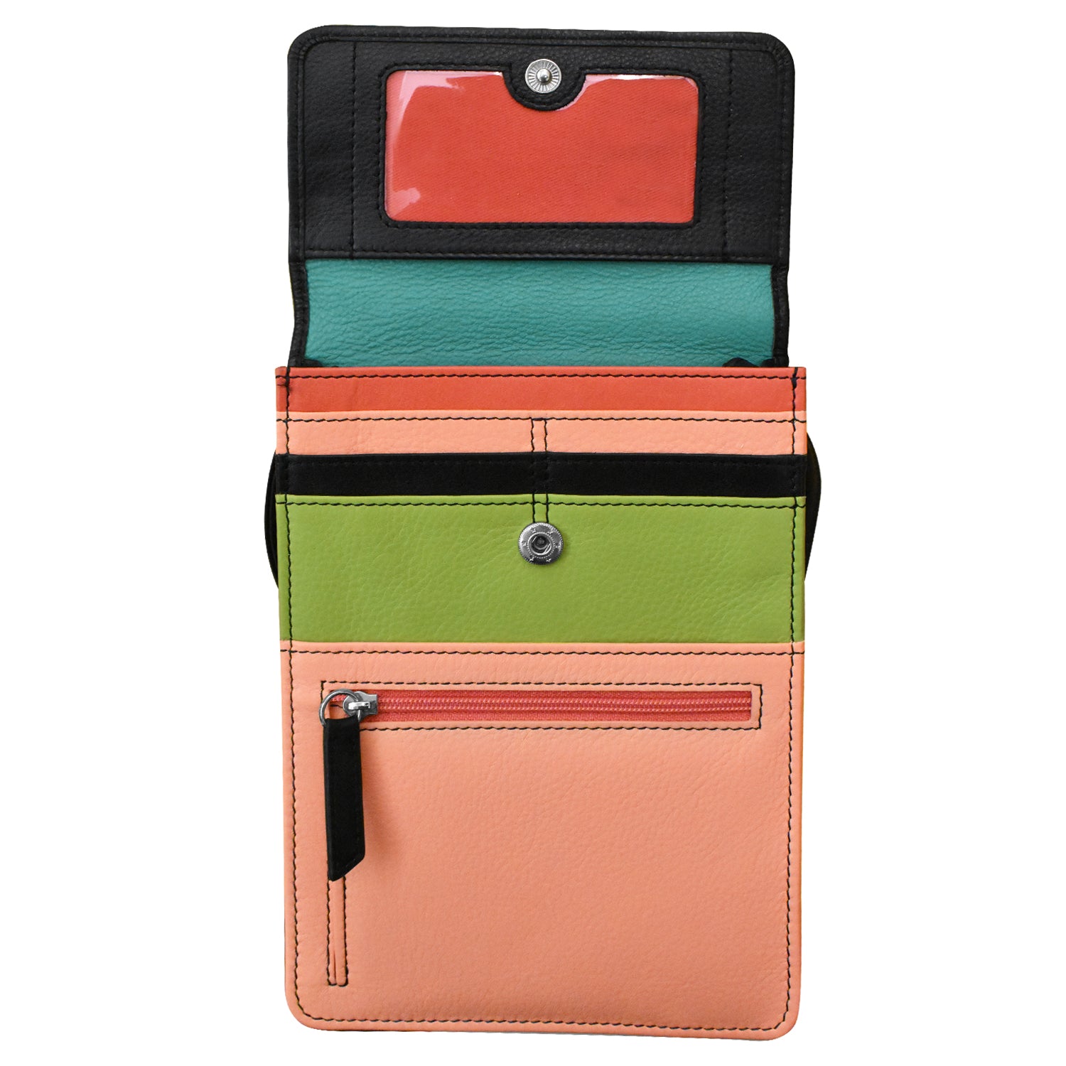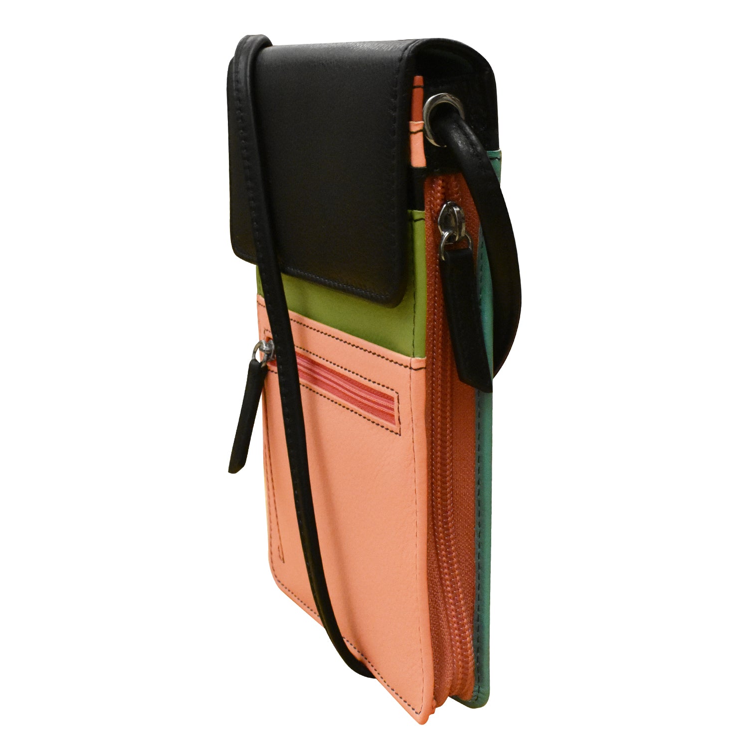 Front slip and zip pockets. Side zip pocket. Back slip and zip pockets. Six credit card slots and I.D. window under flap.