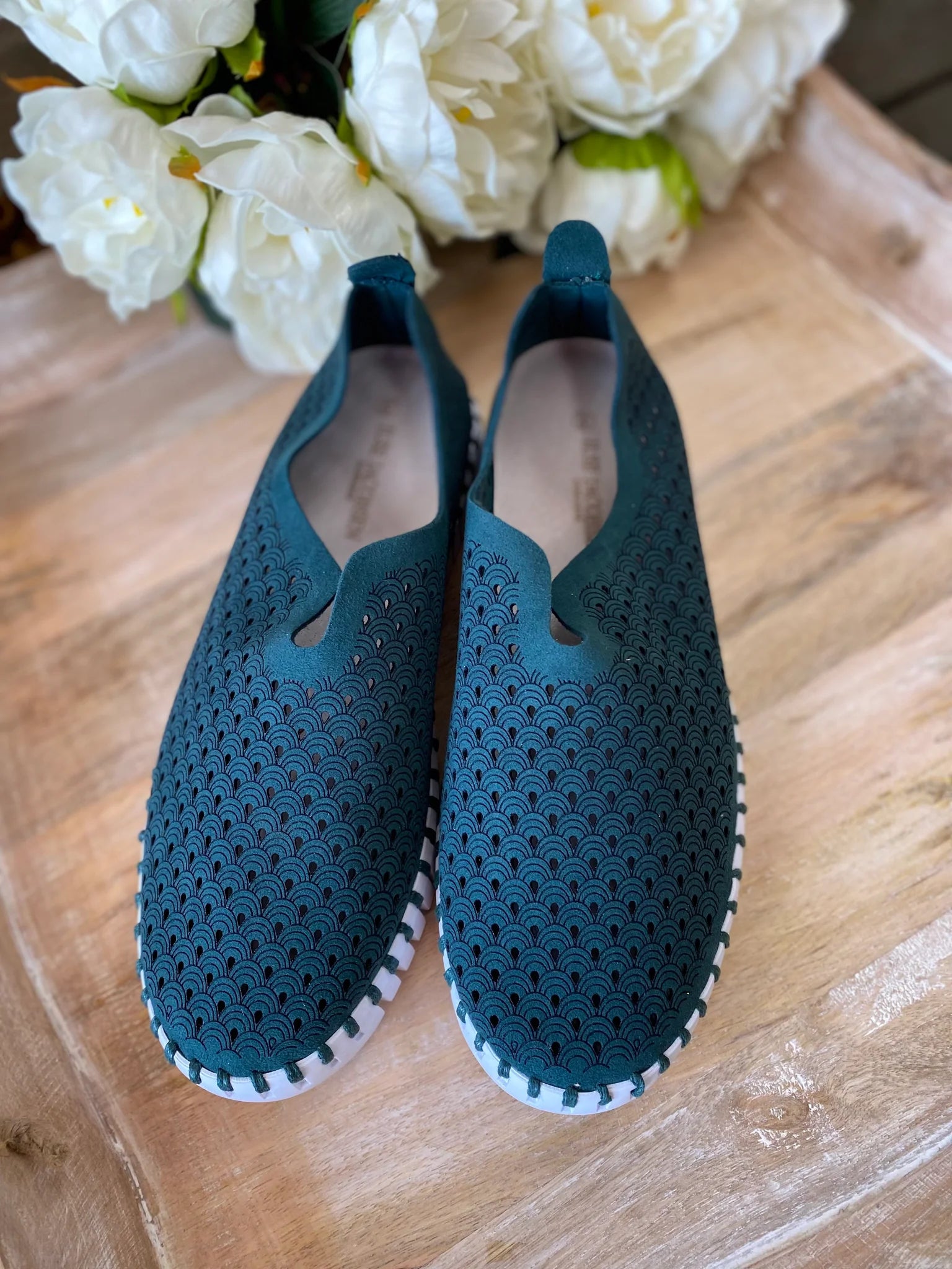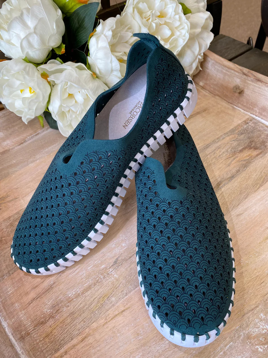 Iconic light weight Tulip shoe by Ilse Jacobsen. The upper is made of recycled microfiber and nicely decorated with a laser cut pattern. The upper construction is made without any glue as it is attached to the outsole using recycled thread. The insole has padding and support, ensuring great comfort. Our iconic Tulip sole is made of 75% natural rubber and 25% recycled rubber. Insole: 60% EVA and 40% pig skin. Upper: Recycled microfiber - 60% nylon, 40% PU.