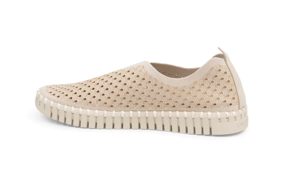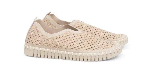 Iconic light weight Tulip shoe by Ilse Jacobsen. The upper is made of recycled microfiber and nicely decorated with a laser cut pattern. The upper construction is made without any glue as it is attached to the outsole using recycled thread. The insole has padding and support, ensuring great comfort. Our iconic Tulip sole is made of 75% natural rubber and 25% recycled rubber. Insole: 60% EVA and 40% pig skin. Upper: Recycled microfiber - 60% nylon, 40% PU.