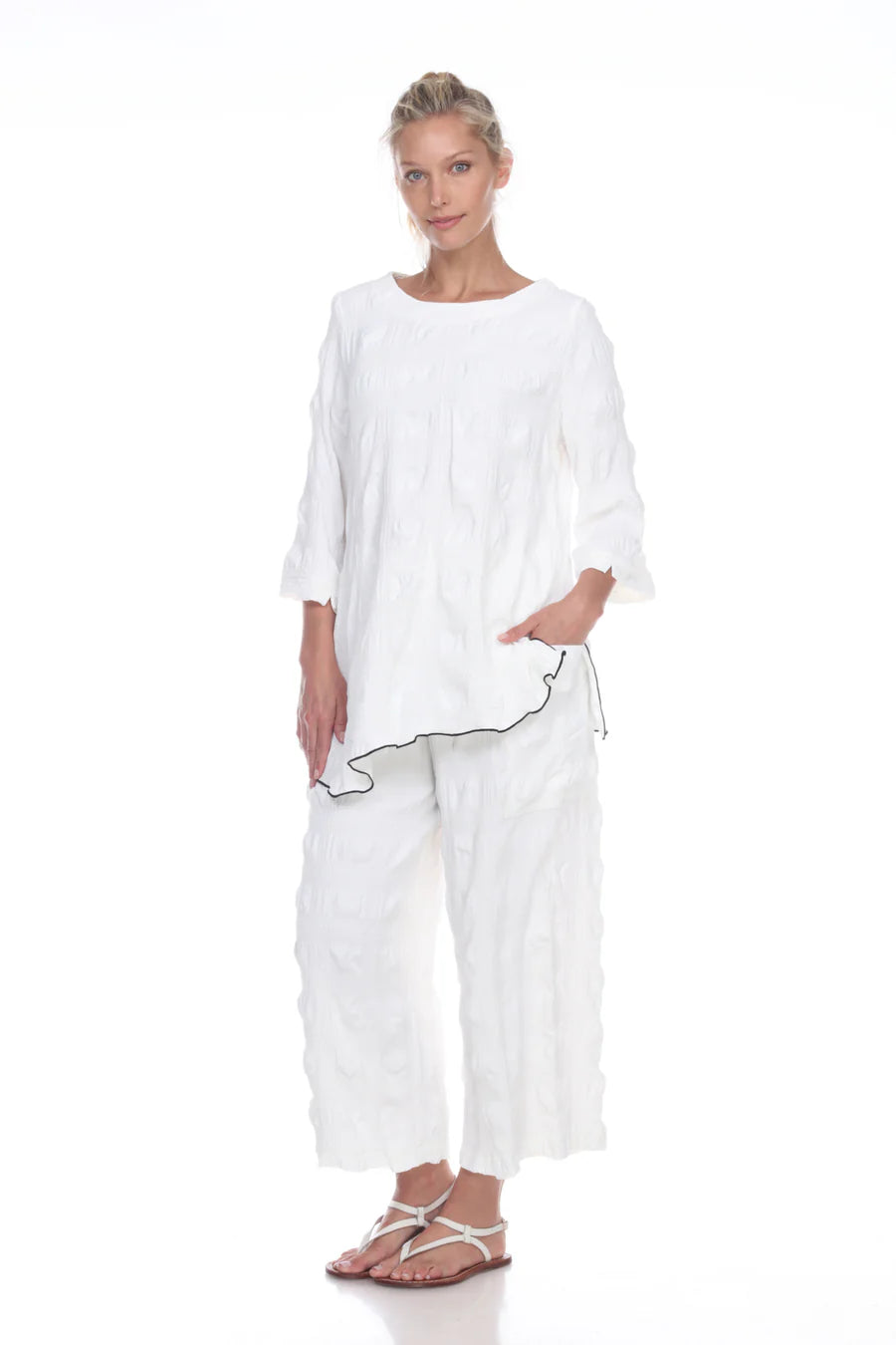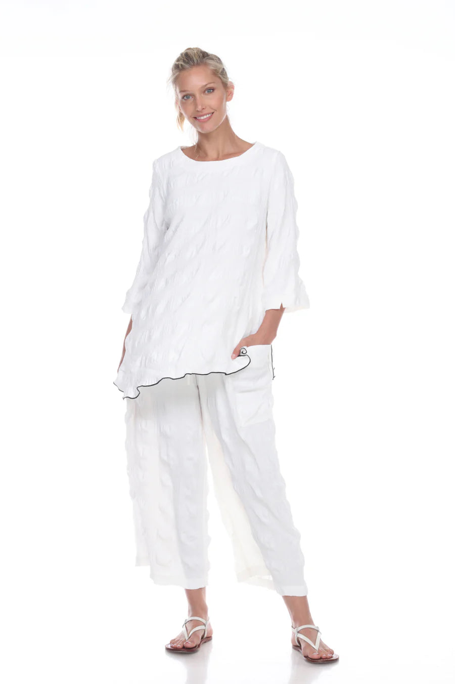 Elevate your wardrobe with the Moonlight Asymmetrical White Tunic, a sophisticated piece that balances modern design with timeless elegance. Featuring a striking asymmetrical silhouette and refined black trim detailing, this tunic offers versatile styling for both casual and polished occasions.
