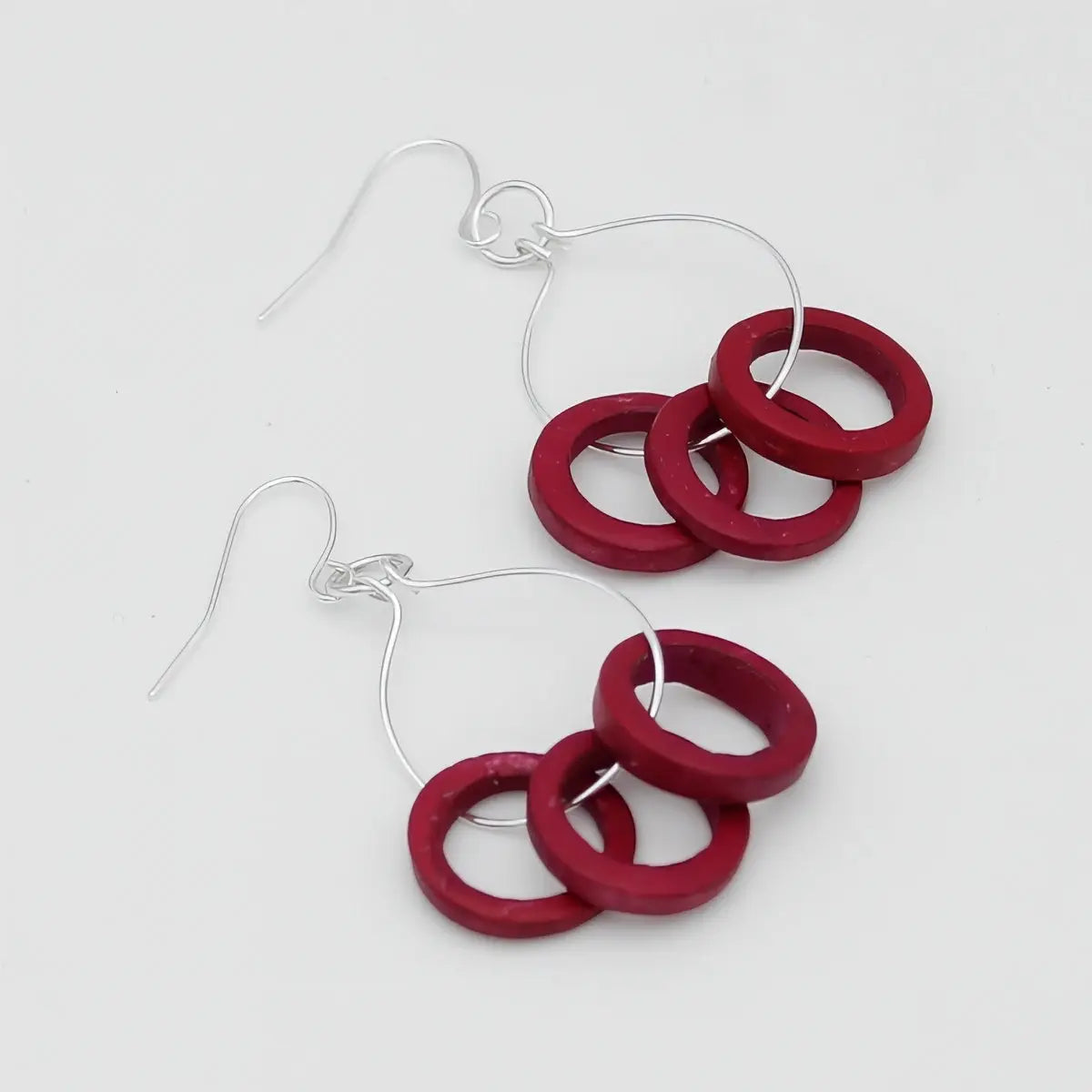 Effortlessly elevate your style with our Three Ring Red Noa Dangle Earrings. Featuring three vibrant red rings suspended from a lightweight and airy silver-toned oval, these dangle earrings are both eye-catching and comfortable to wear. Add a pop of color and sophistication to any outfit with these must-have accessories.