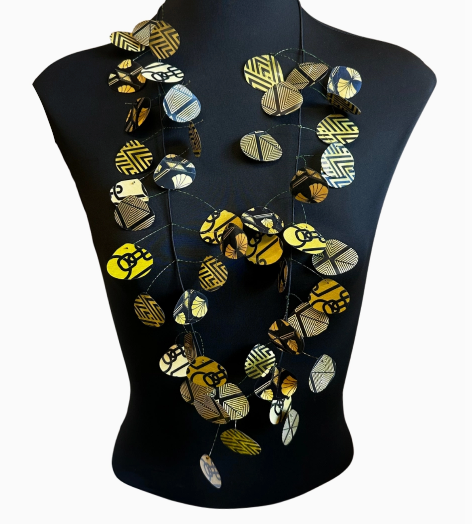 Clamshell shaped resin recycled printed paper necklace on elastic cording.