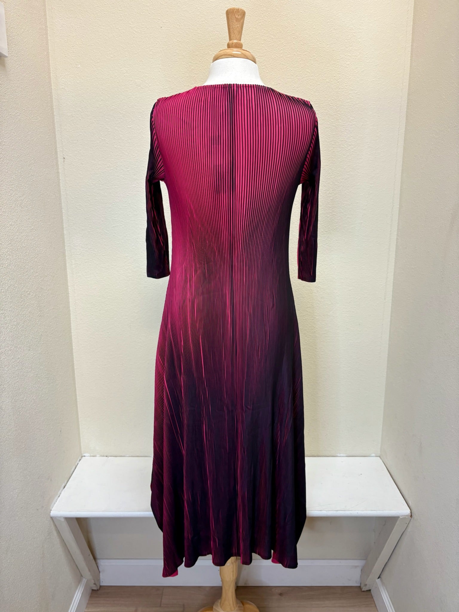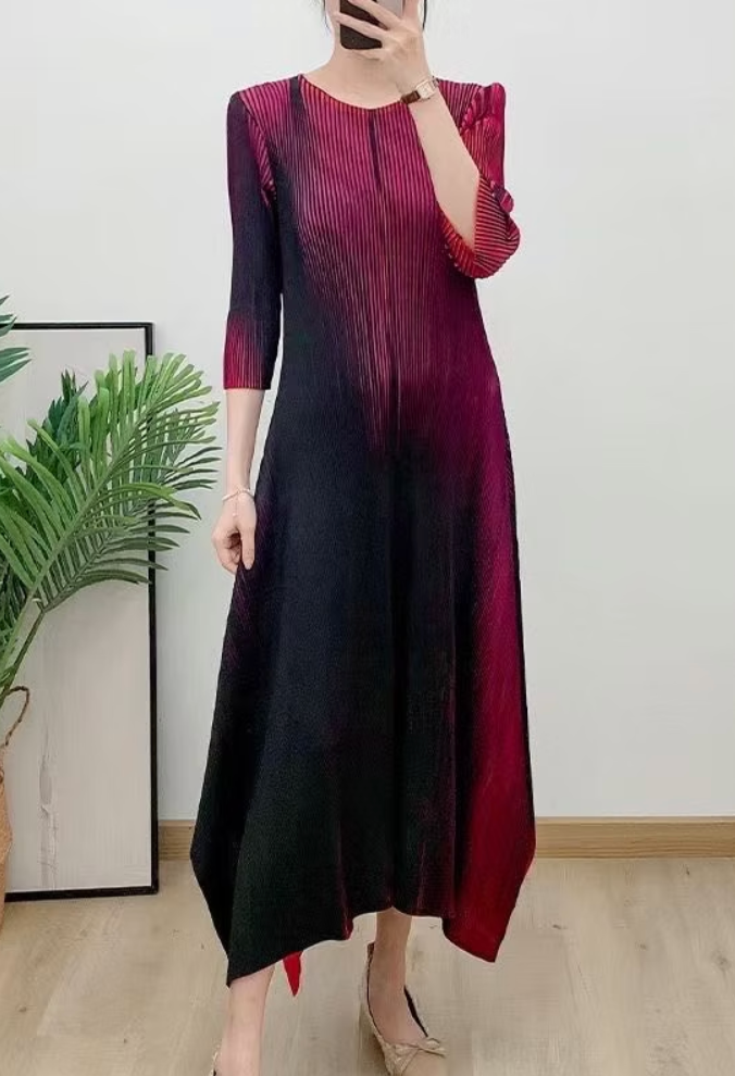 This refined dress showcases intricate pleating and a luxurious deep rose ombre effect that gracefully transitions to black. Designed in a flattering one-size-fits-most silhouette, it combines understated elegance with contemporary style—an essential piece for the discerning wardrobe.